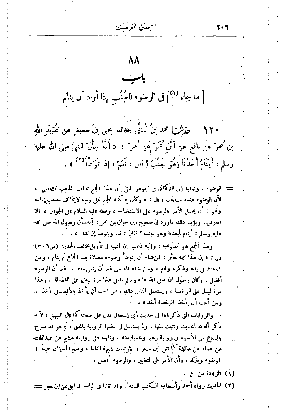120 - حَدَّثَنَا مُحَمَّدُ بْنُ المُثَنَّى قَالَ: حَدَّثَنَا يَحْيَى بْنُ سَعِيدٍ، عَنْ عُبَيْدِ اللَّهِ بْنِ عُمَرَ، عَنْ نَافِعٍ، عَنْ ابْنِ عُمَرَ، عَنْ عُمَرَ، أَنَّهُ سَأَلَ النَّبِيَّ صَلَّى اللَّهُ عَلَيْهِ وَسَلَّمَ §أَيَنَامُ أَحَدُنَا وَهُوَ جُنُبٌ؟، قَالَ: «نَعَمْ، إِذَا تَوَضَّأَ»، -[207]- وَفِي البَابِ عَنْ عَمَّارٍ، وَعَائِشَةَ، وَجَابِرٍ، وَأَبِي سَعِيدٍ، وَأُمِّ سَلَمَةَ، حَدِيثُ عُمَرَ أَحْسَنُ شَيْءٍ فِي هَذَا البَابِ وَأَصَحُّ " وَهُوَ قَوْلُ غَيْرِ وَاحِدٍ مِنْ أَصْحَابِ النَّبِيِّ صَلَّى اللَّهُ عَلَيْهِ وَسَلَّمَ وَالتَّابِعِينَ، وَبِهِ يَقُولُ سُفْيَانُ الثَّوْرِيُّ، وَابْنُ المُبَارَكِ، وَالشَّافِعِيُّ، وَأَحْمَدُ، وَإِسْحَاقُ، قَالُوا: إِذَا أَرَادَ الجُنُبُ أَنْ يَنَامَ تَوَضَّأَ قَبْلَ أَنْ يَنَامَ "