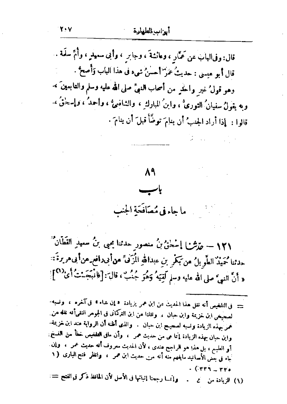 121 - حَدَّثَنَا إِسْحَاقُ بْنُ مَنْصُورٍ قَالَ: حَدَّثَنَا يَحْيَى بْنُ سَعِيدٍ القَطَّانُ قَالَ: حَدَّثَنَا حُمَيْدٌ الطَّوِيلُ، عَنْ بَكْرِ بْنِ عَبْدِ اللَّهِ المُزَنِيِّ، عَنْ أَبِي رَافِعٍ، عَنْ أَبِي هُرَيْرَةَ، أَنَّ النَّبِيَّ صَلَّى اللَّهُ عَلَيْهِ وَسَلَّمَ لَقِيَهُ وَهُوَ جُنُبٌ، قَالَ: -[208]- فَانْبَجَسْتُ، فَاغْتَسَلْتُ، ثُمَّ جِئْتُ، فَقَالَ: «أَيْنَ كُنْتَ؟ - أَوْ أَيْنَ ذَهَبْتَ؟ -» قُلْتُ: إِنِّي كُنْتُ جُنُبًا، قَالَ: «إِنَّ §المُسْلِمَ لَا يَنْجُسُ»، وَفِي البَابِ عَنْ حُذَيْفَةَ، حَدِيثُ أَبِي هُرَيْرَةَ حَدِيثٌ حَسَنٌ صَحِيحٌ، وَقَدْ رَخَّصَ غَيْرُ وَاحِدٍ مِنْ أَهْلِ العِلْمِ فِي مُصَافَحَةِ الجُنُبِ، وَلَمْ يَرَوْا بِعَرَقِ الجُنُبِ، وَالحَائِضِ بَأْسًا