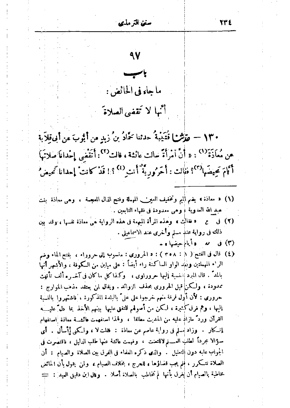 130 - حَدَّثَنَا قُتَيْبَةُ قَالَ: حَدَّثَنَا حَمَّادُ بْنُ زَيدٍ، عَنْ أَيُّوبَ، عَنْ أَبِي قِلَابَةَ، عَنْ مُعَاذَةَ، أَنَّ امْرَأَةً سَأَلَتْ عَائِشَةَ، قَالَتْ: أَتَقْضِي إِحْدَانَا صَلَاتَهَا أَيَّامَ مَحِيضِهَا؟ فَقَالَتْ: أَحَرُورِيَّةٌ أَنْتِ؟ «قَدْ §كَانَتْ إِحْدَانَا تَحِيضُ -[235]- فَلَا تُؤْمَرُ بِقَضَاءٍ»، هَذَا حَدِيثٌ حَسَنٌ صَحِيحٌ، وَقَدْ رُوِيَ عَنْ عَائِشَةَ مِنْ غَيْرِ وَجْهٍ أَنَّ الحَائِضَ لَا تَقْضِي الصَّلَاةَ، وَهُوَ قَوْلُ عَامَّةِ الفُقَهَاءِ لَا اخْتِلَافَ بَيْنَهُمْ فِي أَنَّ الحَائِضَ تَقْضِي الصَّوْمَ وَلَا تَقْضِي الصَّلَاةَ