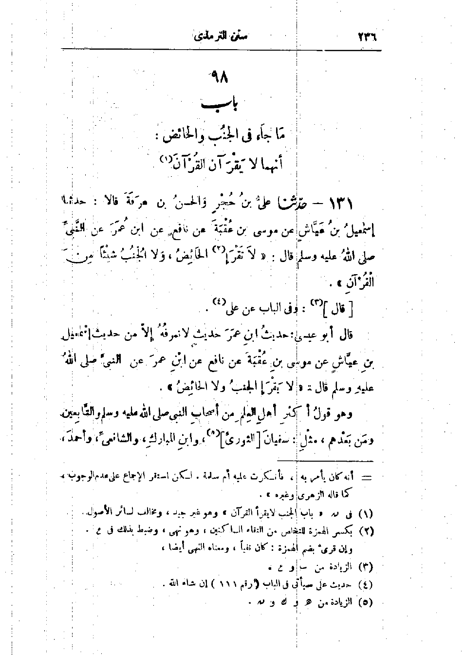 131 - حَدَّثَنَا عَلِيُّ بْنُ حُجْرٍ، وَالحَسَنُ بْنُ عَرَفَةَ، قَالَا: حَدَّثَنَا إِسْمَاعِيلُ بْنُ عَيَّاشٍ، عَنْ مُوسَى بْنِ عُقْبَةَ، عَنْ نَافِعٍ، عَنْ ابْنِ عُمَرَ، عَنِ النَّبِيِّ صَلَّى اللَّهُ عَلَيْهِ وَسَلَّمَ قَالَ: «§لَا تَقْرَأِ الحَائِضُ، وَلَا الجُنُبُ شَيْئًا مِنَ القُرْآنِ»، وَفِي البَابِ عَنْ عَلِيٍّ، حَدِيثُ ابْنِ عُمَرَ حَدِيثٌ لَا نَعْرِفُهُ إِلَّا مِنْ حَدِيثِ إِسْمَاعِيلَ بْنِ عَيَّاشٍ "، عَنْ مُوسَى بْنِ عُقْبَةَ، عَنْ نَافِعٍ، عَنْ ابْنِ عُمَرَ، عَنِ النَّبِيِّ صَلَّى اللَّهُ عَلَيْهِ وَسَلَّمَ قَالَ: «لَا تَقْرَأِ الجُنُبُ وَلَا الحَائِضُ» وَهُوَ قَوْلُ أَكْثَرِ أَهْلِ العِلْمِ مِنْ أَصْحَابِ النَّبِيِّ صَلَّى اللَّهُ عَلَيْهِ وَسَلَّمَ، وَالتَّابِعِينَ، وَمَنْ بَعْدَهُمْ مِثْلِ: سُفْيَانَ الثَّوْرِيِّ، وَابْنِ المُبَارَكِ، وَالشَّافِعِيِّ، وَأَحْمَدَ، -[237]- وَإِسْحَاقَ، قَالُوا: لَا تَقْرَأِ الحَائِضُ وَلَا الجُنُبُ مِنَ القُرْآنِ شَيْئًا، إِلَّا طَرَفَ الآيَةِ وَالحَرْفَ وَنَحْوَ ذَلِكَ، وَرَخَّصُوا لِلْجُنُبِ وَالحَائِضِ فِي التَّسْبِيحِ وَالتَّهْلِيلِ "، وسَمِعْت مُحَمَّدَ بْنَ إِسْمَاعِيلَ، يَقُولُ: «إِنَّ إِسْمَاعِيلَ بْنَ عَيَّاشٍ يَرْوِي عَنْ أَهْلِ الحِجَازِ، وَأَهْلِ العِرَاقِ أَحَادِيثَ مَنَاكِيرَ، كَأَنَّهُ ضَعَّفَ رِوَايَتَهُ عَنْهُمْ فِيمَا يَتَفَرَّدُ بِهِ»، وَقَالَ: «إِنَّمَا حَدِيثُ إِسْمَاعِيلَ بْنَ عَيَّاشٍ عَنْ أَهْلِ الشَّأْمِ» وقَالَ أَحْمَدُ بْنُ حَنْبَلٍ: «إِسْمَاعِيلُ بْنُ عَيَّاشٍ أَصْلَحُ مِنْ بَقِيَّةَ، وَلِبَقِيَّةَ أَحَادِيثُ مَنَاكِيرُ عَنِ الثِّقَاتِ». حَدَّثَنِي بِذَلِكَ أَحْمَدُ بْنُ الحَسَنِ، قَال: سَمِعْتُ أَحْمَدَ بْنَ حَنْبَلٍ يَقُولُ ذَلِك