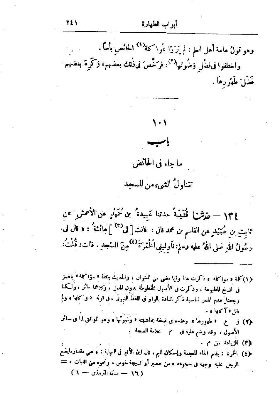 134 - حَدَّثَنَا قُتَيْبَةُ قَالَ: حَدَّثَنَا عَبِيدَةُ بْنُ حُمَيْدٍ، عَنْ الأَعْمَشِ، عَنْ ثابِتِ بْنِ عُبَيْدٍ، عَنْ القَاسِمِ بْنِ مُحَمَّدٍ، قَالَ: قَالَتْ عَائِشَةُ: قَالَ لِي رَسُولُ اللَّهِ صَلَّى اللَّهُ عَلَيْهِ وَسَلَّمَ: «نَاوِلِينِي الخُمْرَةَ مِنَ المَسْجِدِ»، قَالَتْ: قُلْتُ: -[242]- إِنِّي حَائِضٌ، قَالَ: «إِنَّ §حَيْضَتَكِ لَيْسَتْ فِي يَدِكِ»، وَفِي البَابِ عَنْ ابْنِ عُمَرَ، وَأَبِي هُرَيْرَةَ، حَدِيثُ عَائِشَةَ حَدِيثٌ حَسَنٌ، وَهُوَ قَوْلُ عَامَّةِ أَهْلِ العِلْمِ، لَا نَعْلَمُ بَيْنَهُمْ اخْتِلَافًا فِي ذَلِكَ: بِأَنْ لَا بَأْسَ أَنْ تَتَنَاوَلَ الحَائِضُ شَيْئًا مِنَ المَسْجِدِ