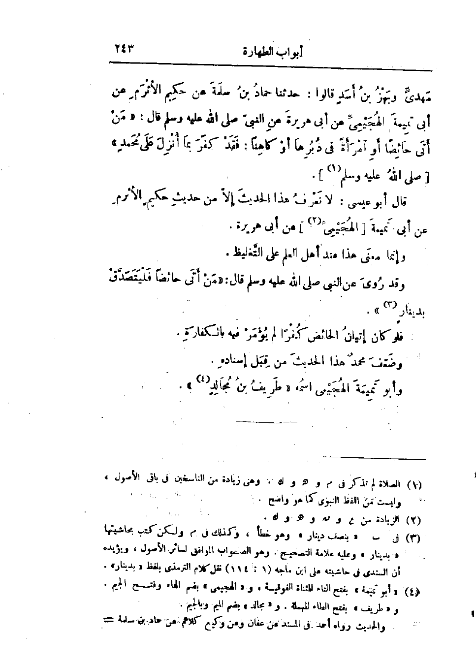 وَقَدْ رُوِيَ عَنِ النَّبِيِّ صَلَّى اللَّهُ عَلَيْهِ وَسَلَّمَ قَالَ: «§مَنْ أَتَى حَائِضًا فَلْيَتَصَدَّقْ بِدِينَارٍ» فَلَوْ كَانَ إِتْيَانُ الحَائِضِ كُفْرًا لَمْ يُؤْمَرْ فِيهِ بِالكَفَّارَةِ، وَضَعَّفَ مُحَمَّدٌ هَذَا الحَدِيثَ مِنْ قِبَلِ إِسْنَادِهِ، وَأَبُو تَمِيمَةَ الهُجَيْمِيِّ اسْمُهُ طَرِيفُ بْنُ مُجَالِدٍ