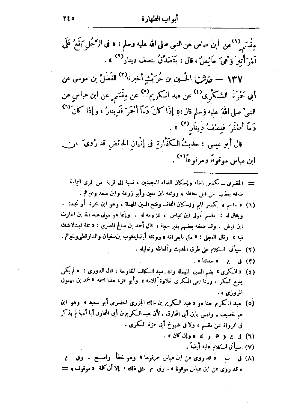 137 - حَدَّثَنَا الحُسَيْنُ بْنُ حُرَيْثٍ قَالَ: حَدَّثَنَا الفَضْلُ بْنُ مُوسَى، عَنْ أَبِي حَمْزَةَ السُّكَّرِيِّ، عَنْ عَبْدِ الكَرِيمِ، عَنْ مِقْسَمٍ، عَنْ ابْنِ عَبَّاسٍ، عَنِ النَّبِيِّ صَلَّى اللَّهُ عَلَيْهِ وَسَلَّمَ قَالَ: «§إِذَا كَانَ دَمًا أَحْمَرَ فَدِينَارٌ، وَإِذَا كَانَ دَمًا أَصْفَرَ فَنِصْفُ دِينَارٍ»، حَدِيثُ الكَفَّارَةِ فِي إِتْيَانِ الحَائِضِ قَدْ رُوِيَ عَنْ ابْنِ عَبَّاسٍ مَوْقُوفًا وَمَرْفُوعًا، -[246]- وَهُوَ قَوْلُ بَعْضِ أَهْلِ العِلْمِ وَبِهِ يَقُولُ أَحْمَدُ، وَإِسْحَاقُ. -[247]- وَقَالَ ابْنُ المُبَارَكِ: يَسْتَغْفِرُ رَبَّهُ وَلَا كَفَّارَةَ عَلَيْهِ. -[254]- وَقَدْ رُوِيَ مِثْلُ قَوْلِ ابْنِ المُبَارَكِ، عَنْ بَعْضِ التَّابِعِينَ مِنْهُمْ: سَعِيدُ بْنُ جُبَيْرٍ، وَإِبْرَاهِيمُ النَّخَعِيُّ، وَهُوَ قَوْلُ عَامَّةِ عُلَمَاءِ الأَمْصَارِ