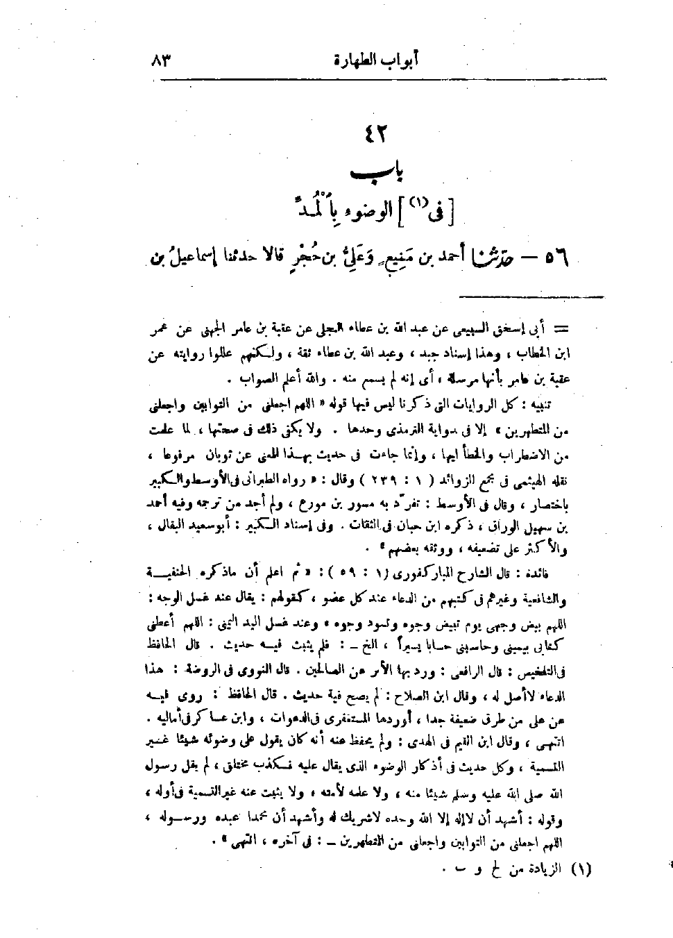 56 - حَدَّثَنَا أَحْمَدُ بْنُ مَنِيعٍ، وَعَليُّ بْنُ حُجْرٍ، قَالَا: حَدَّثَنَا إِسْمَاعِيلُ ابْنُ -[84]- عُلَيَّةَ، عَنْ أَبِي رَيْحَانَةَ، عَنْ سَفِينَةَ: «أَنَّ النَّبِيَّ صَلَّى اللَّهُ عَلَيْهِ وَسَلَّمَ كَانَ §يَتَوَضَّأُ بِالمُدِّ، وَيَغْتَسِلُ بِالصَّاعِ»، وَفِي البَابِ عَنْ عَائِشَةَ، وَجَابِرٍ، وَأَنَسِ بْنِ مَالِكٍ، حَدِيثُ سَفِينَةَ حَدِيثٌ حَسَنٌ صَحِيحٌ، وَأَبُو رَيْحَانَةَ اسمه عَبْدُ اللَّهِ بْنُ مَطَرٍ، وَهَكَذَا رَأَى بَعْضُ أَهْلِ العِلْمِ الوُضُوءَ بِالمُدِّ، وَالغُسْلَ بِالصَّاعِ، وقَالَ الشَّافِعِيُّ، وَأَحْمَدُ، وَإِسْحَاقُ: «لَيْسَ مَعْنَى هَذَا الحَدِيثِ عَلَى التَّوَقِّيتِ أَنَّهُ لَا يَجُوزُ أَكْثَرُ مِنْهُ، وَلَا أَقَلُّ مِنْهُ وَهُوَ قَدْرُ مَا يَكْفِي»