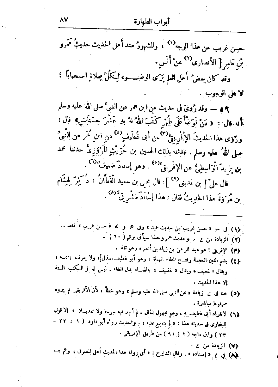 59 - وَقَدْ رُوِيَ فِي حَدِيثٍ عَنِ ابْنِ عُمَرَ، عَنِ النَّبِيِّ صَلَّى اللَّهُ عَلَيْهِ وَسَلَّمَ أَنَّهُ قَالَ: «§مَنْ تَوَضَّأَ عَلَى طُهْرٍ كَتَبَ اللَّهُ لَهُ بِهِ عَشْرَ حَسَنَاتٍ». وَرَوَى هَذَا الحَدِيثَ الْإِفْرِيقِيُّ، عَنْ أَبِي غُطَيْفٍ، عَنِ ابْنِ عُمَرَ، عَنِ النَّبِيِّ صَلَّى اللَّهُ عَلَيْهِ وَسَلَّمَ، حَدَّثَنَا بِذَلِكَ الحُسَيْنُ بْنُ حُرَيْثٍ المَرْوَزِيُّ قَالَ: حَدَّثَنَا مُحَمَّدُ بْنُ يَزِيدَ الوَاسِطِيُّ، عَنِ الْإفْرِيقِيِّ، وَهُوَ إِسْنَادٌ ضَعِيفٌ، قَالَ عَلِيٌّ: قَالَ يَحْيَى بْنُ سَعِيدٍ القَطَّانُ: ذُكِرَ لِهِشَامِ بْنِ عُرْوَةَ هَذَا الحَدِيثُ، فَقَالَ: «هَذَا إِسْنَادٌ مَشْرِقِيٌّ»