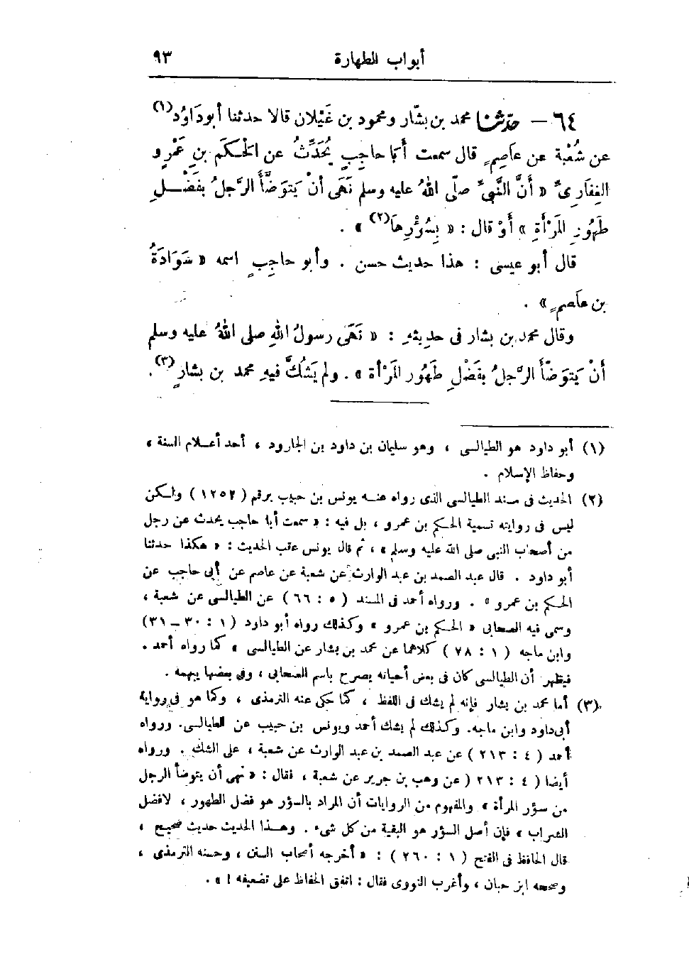 64 - حَدَّثَنَا مُحَمَّدُ بْنُ بَشَّارٍ، وَمَحْمُودُ بْنُ غَيْلَانَ، قَالَا: حَدَّثَنَا أَبُو دَاوُدَ، عَنْ شُعْبَةَ، عَنْ عَاصِمٍ، قَال: سَمِعْتُ أَبَا حَاجِبٍ يُحَدِّثُ، عَنْ الحَكَمِ بْنِ عَمْرٍو الغِفَارِيِّ: " أَنَّ النَّبِيَّ صَلَّى اللَّهُ عَلَيْهِ وَسَلَّمَ §نَهَى أَنْ يَتَوَضَّأَ الرَّجُلُ بِفَضْلِ طَهُورِ المَرْأَةِ - أَوْ قَالَ: بِسُؤْرِهَا - "، هَذَا حَدِيثٌ حَسَنٌ، وَأَبُو حَاجِبٍ اسمه سَوَادَةُ بْنُ عَاصِمٍ، وقَالَ مُحَمَّدُ بْنُ بَشَّارٍ فِي حَدِيثِهِ: «نَهَى رَسُولُ اللَّهِ صَلَّى اللَّهُ عَلَيْهِ وَسَلَّمَ أَنْ يَتَوَضَّأَ الرَّجُلُ بِفَضْلِ طَهُورِ المَرْأَةِ»، وَلَمْ يَشُكَّ فِيهِ مُحَمَّدُ بْنُ بَشَّارٍ