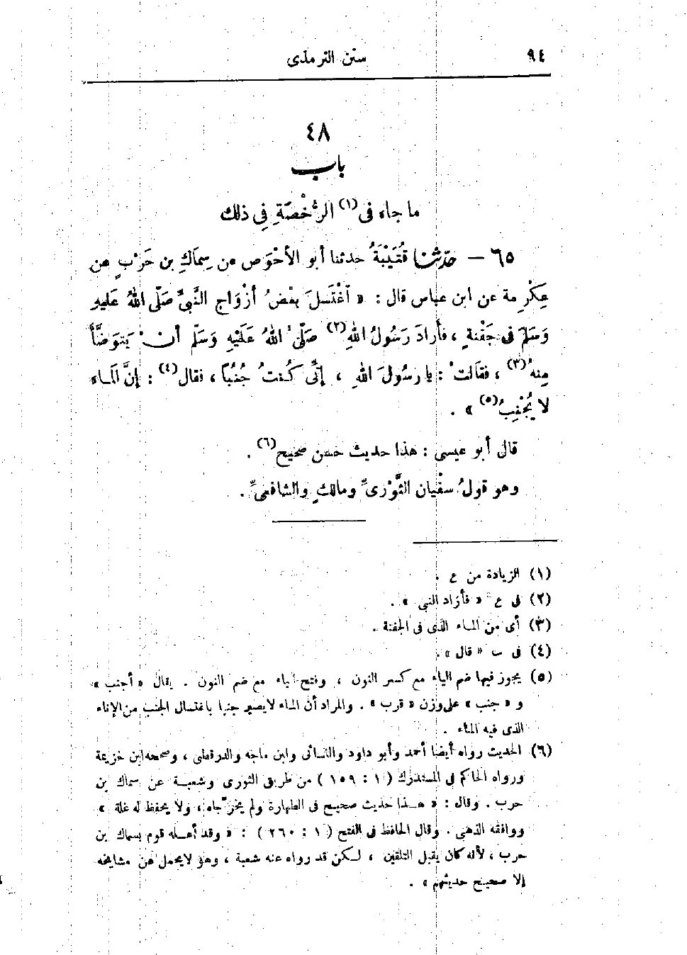 65 - حَدَّثَنَا قُتَيْبَةُ قَالَ: حَدَّثَنَا أَبُو الأَحْوَصِ، عَنْ سِمَاكِ بْنِ حَرْبٍ، عَنْ عِكْرِمَةَ، عَنْ ابْنِ عَبَّاسٍ، قَالَ: اغْتَسَلَ بَعْضُ أَزْوَاجِ النَّبِيِّ صَلَّى اللَّهُ عَلَيْهِ وَسَلَّمَ فِي جَفْنَةٍ، فَأَرَادَ رَسُولُ اللَّهِ صَلَّى اللَّهُ عَلَيْهِ وَسَلَّمَ أَنْ يَتَوَضَّأَ مِنْهُ، فَقَالَتْ: يَا رَسُولَ اللَّهِ، إِنِّي كُنْتُ جُنُبًا، فَقَالَ: «إِنَّ §المَاءَ لَا يُجْنِبُ». هَذَا حَدِيثٌ حَسَنٌ صَحِيحٌ، وَهُوَ قَوْلُ سُفْيَانَ الثَّوْرِيِّ، وَمَالِكٍ، وَالشَّافِعِيِّ