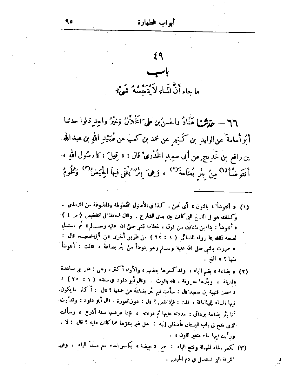 66 - حَدَّثَنَا هَنَّادٌ، وَالحَسَنُ بْنُ عَلِيٍّ الخَلَّالُ، وَغَيْرُ وَاحِدٍ، قَالُوا: حَدَّثَنَا أَبُو أُسَامَةَ، عَنْ الوَلِيدِ بْنِ كَثِيرٍ، عَنْ مُحَمَّدِ بْنِ كَعْبٍ، عَنْ عُبَيْدِ اللَّهِ بْنِ عَبْدِ اللَّهِ بْنِ رَافِعِ بْنِ خَدِيجٍ، عَنْ أَبِي سَعِيدٍ الخُدْرِيِّ، قَالَ: قِيلَ: يَا رَسُولَ اللَّهِ، أَتَتَوَضَّأُ مِنْ بِئْرِ بُضَاعَةَ، وَهِيَ بِئْرٌ يُلْقَى فِيهَا الحِيَضُ، وَلُحُومُ -[96]- الكِلَابِ، وَالنَّتْنُ؟ فَقَالَ رَسُولُ اللَّهِ صَلَّى اللَّهُ عَلَيْهِ وَسَلَّمَ: «إِنَّ §المَاءَ طَهُورٌ لَا يُنَجِّسُهُ شَيْءٌ». هَذَا حَدِيثٌ حَسَنٌ، وَقَدْ جَوَّدَ أَبُو أُسَامَةَ هَذَا الحَدِيثَ، فَلَمْ يَرْوِ أَحَدٌ حَدِيثَ أَبِي سَعِيدٍ فِي بِئْرِ بُضَاعَةَ أَحْسَنَ مِمَّا رَوَى أَبُو أُسَامَةَ، وَقَدْ رُوِيَ هَذَا الحَدِيثُ مِنْ غَيْرِ وَجْهٍ عَنْ أَبِي سَعِيدٍ، -[97]- وَفِي البَابِ عَنْ ابْنِ عَبَّاسٍ، وَعَائِشَةَ