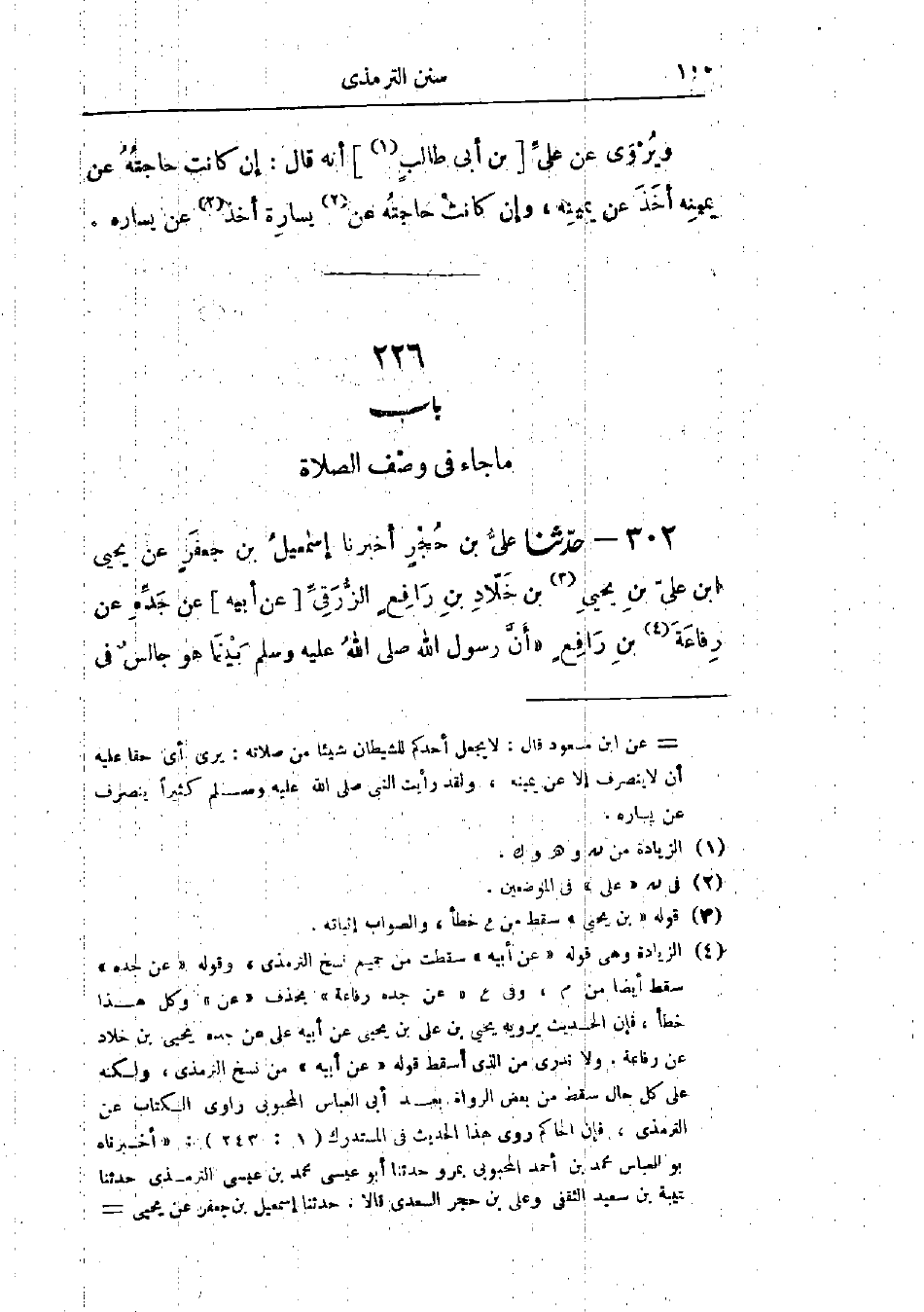 302 - حَدَّثَنَا عَلِيُّ بْنُ حُجْرٍ قَالَ: أَخْبَرَنَا إِسْمَاعِيلُ بْنُ جَعْفَرٍ، عَنْ يَحْيَى بْنِ عَلِيِّ بْنِ يَحْيَى بْنِ خَلَّادِ بْنِ رَافِعٍ الزُّرَقِيِّ، عَنْ جَدِّهِ، عَنْ رِفَاعَةَ بْنِ رَافِعٍ، أَنَّ رَسُولَ اللَّهِ صَلَّى اللَّهُ عَلَيْهِ وَسَلَّمَ بَيْنَمَا هُوَ جَالِسٌ فِي -[101]- المَسْجِدِ يَوْمًا، قَالَ رِفَاعَةُ وَنَحْنُ مَعَهُ: إِذْ جَاءَهُ رَجُلٌ كَالبَدَوِيِّ، فَصَلَّى فَأَخَفَّ صَلَاتَهُ، ثُمَّ انْصَرَفَ، فَسَلَّمَ عَلَى النَّبِيِّ صَلَّى اللَّهُ عَلَيْهِ وَسَلَّمَ، فَقَالَ النَّبِيُّ صَلَّى اللَّهُ عَلَيْهِ وَسَلَّمَ: «وَعَلَيْكَ، فَارْجِعْ فَصَلِّ فَإِنَّكَ لَمْ تُصَلِّ»، فَرَجَعَ فَصَلَّى، ثُمَّ جَاءَ فَسَلَّمَ عَلَيْهِ، فَقَالَ: «وَعَلَيْكَ، فَارْجِعْ فَصَلِّ فَإِنَّكَ لَمْ تُصَلِّ»، فَفَعَلَ ذَلِكَ مَرَّتَيْنِ أَوْ ثَلَاثًا، كُلُّ ذَلِكَ يَأْتِي النَّبِيَّ صَلَّى اللَّهُ عَلَيْهِ وَسَلَّمَ فَيُسَلِّمُ عَلَى النَّبِيِّ صَلَّى اللَّهُ عَلَيْهِ وَسَلَّمَ، فَيَقُولُ النَّبِيُّ صَلَّى اللَّهُ عَلَيْهِ وَسَلَّمَ: -[102]- «وَعَلَيْكَ، فَارْجِعْ فَصَلِّ فَإِنَّكَ لَمْ تُصَلِّ»، فَخَافَ النَّاسُ وَكَبُرَ عَلَيْهِمْ أَنْ يَكُونَ مَنْ أَخَفَّ صَلَاتَهُ لَمْ يُصَلِّ، فَقَالَ الرَّجُلُ فِي آخِرِ ذَلِكَ: فَأَرِنِي وَعَلِّمْنِي، فَإِنَّمَا أَنَا بَشَرٌ أُصِيبُ وَأُخْطِئُ، فَقَالَ: «أَجَلْ §إِذَا قُمْتَ إِلَى الصَّلَاةِ فَتَوَضَّأْ كَمَا أَمَرَكَ اللَّهُ، ثُمَّ تَشَهَّدْ فَأَقِمْ أَيْضًا، فَإِنْ كَانَ مَعَكَ قُرْآنٌ فَاقْرَأْ، وَإِلَّا فَاحْمَدِ اللَّهَ وَكَبِّرْهُ وَهَلِّلْهُ، ثُمَّ ارْكَعْ فَاطْمَئِنَّ رَاكِعًا، ثُمَّ اعْتَدِلْ قَائِمًا، ثُمَّ اسْجُدْ فَاعْتَدِلْ سَاجِدًا، ثُمَّ اجْلِسْ فَاطْمَئِنَّ جَالِسًا، ثُمَّ قُمْ، فَإِذَا فَعَلْتَ ذَلِكَ فَقَدْ تَمَّتْ صَلَاتُكَ، وَإِنْ انْتَقَصْتَ مِنْهُ شَيْئًا انْتَقَصْتَ مِنْ صَلَاتِكَ»، قَالَ: وَكَانَ هَذَا أَهْوَنَ عَلَيْهِمْ مِنَ الأَوَّلِ، أَنَّهُ مَنْ انْتَقَصَ مِنْ ذَلِكَ شَيْئًا انْتَقَصَ مِنْ صَلَاتِهِ، وَلَمْ تَذْهَبْ كُلُّهَا، وَفِي البَابِ عَنْ أَبِي هُرَيْرَةَ، وَعَمَّارِ بْنِ يَاسِرٍ، «حَدِيثُ رِفَاعَةَ بْنِ رَافِعٍ حَدِيثٌ حَسَنٌ، وَقَدْ رُوِيَ عَنْ رِفَاعَةَ هَذَا الحَدِيثُ مِنْ غَيْرِ وَجْهٍ»