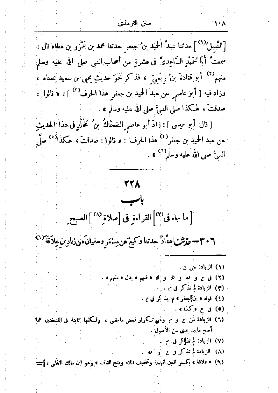 306 - حَدَّثَنَا هَنَّادٌ قَالَ: حَدَّثَنَا وَكِيعٌ، عَنْ مِسْعَرٍ، وَسُفْيَانَ، عَنْ زِيَادِ بْنِ عَلَاقَةَ، -[109]- عَنْ عَمِّهِ قُطْبَةَ بْنِ مَالِكٍ، قَالَ: سَمِعْتُ رَسُولَ اللَّهِ صَلَّى اللَّهُ عَلَيْهِ وَسَلَّمَ " §يَقْرَأُ فِي الفَجْرِ: وَالنَّخْلَ بَاسِقَاتٍ فِي الرَّكْعَةِ الأُولَى «، وَفِي البَابِ عَنْ عَمْرِو بْنِ حُرَيْثٍ، وَجَابِرِ بْنِ سَمُرَةَ، وَعَبْدِ اللَّهِ بْنِ السَّائِبِ، وَأَبِي بَرْزَةَ، وَأُمِّ سَلَمَةَ،» حَدِيثُ قُطْبَةَ بْنِ مَالِكٍ حَدِيثٌ حَسَنٌ صَحِيحٌ، وَرُوِيَ عَنِ النَّبِيِّ صَلَّى اللَّهُ عَلَيْهِ وَسَلَّمَ أَنَّهُ «قَرَأَ فِي الصُّبْحِ بِالوَاقِعَةِ، وَرُوِيَ عَنْهُ أَنَّهُ» كَانَ يَقْرَأُ فِي الفَجْرِ مِنْ سِتِّينَ آيَةً إِلَى مِائَة، وَرُوِيَ عَنْهُ أَنَّهُ " قَرَأَ: إِذَا الشَّمْسُ كُوِّرَتْ، -[110]- وَرُوِي عَنْ عُمَرَ أَنَّهُ كَتَبَ إِلَى أَبِي مُوسَى: «أَنْ اقْرَأْ فِي الصُّبْحِ بِطِوَالِ المُفَصَّلِ»، وَعَلَى هَذَا العَمَلُ عِنْدَ أَهْلِ العِلْمِ، وَبِهِ يَقُولُ سُفْيَانُ الثَّوْرِيُّ، وَابْنُ المُبَارَكِ، وَالشَّافِعِيُّ