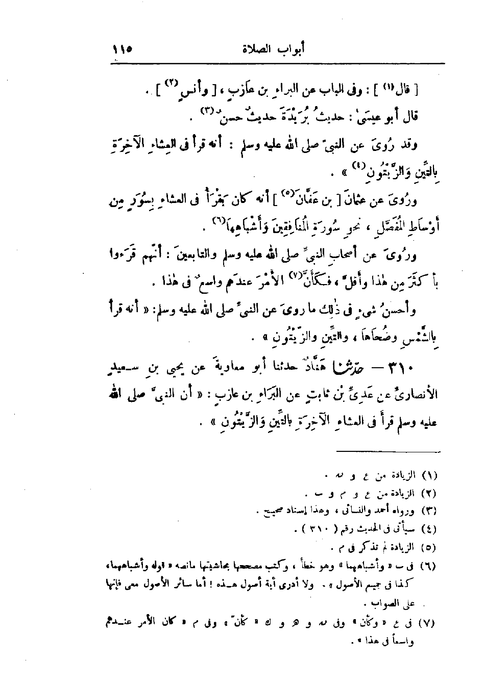 310 - حَدَّثَنَا هَنَّادٌ قَالَ: حَدَّثَنَا أَبُو مُعَاوِيَةَ، عَنْ يَحْيَى بْنِ سَعِيدٍ الأَنْصَارِيِّ، عَنْ عَدِيِّ بْنِ ثَابِتٍ، عَنْ البَرَاءِ بْنِ عَازِبٍ، «أَنَّ النَّبِيَّ صَلَّى اللَّهُ عَلَيْهِ وَسَلَّمَ §قَرَأَ فِي العِشَاءِ الآخِرَةِ بِالتِّينِ وَالزَّيْتُونِ»،: -[116]- «وَهَذَا حَدِيثٌ حَسَنٌ صَحِيحٌ»
