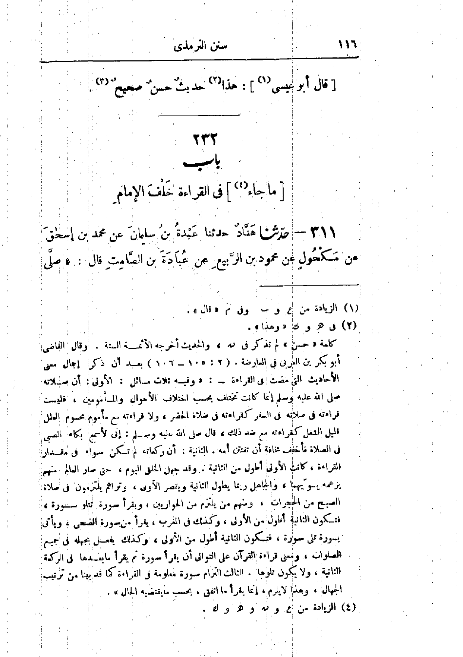 311 - حَدَّثَنَا هَنَّادٌ قَالَ: حَدَّثَنَا عَبْدَةُ بْنُ سُلَيْمَانَ، عَنْ مُحَمَّدِ بْنِ إِسْحَاقَ، عَنْ مَكْحُولٍ، عَنْ مَحْمُودِ بْنِ الرَّبِيعِ، عَنْ عُبَادَةَ بْنِ الصَّامِتِ، قَالَ: صَلَّى -[117]- رَسُولُ اللَّهِ صَلَّى اللَّهُ عَلَيْهِ وَسَلَّمَ الصُّبْحَ، فَثَقُلَتْ عَلَيْهِ القِرَاءَةُ، فَلَمَّا انْصَرَفَ قَالَ: «إِنِّي أَرَاكُمْ تَقْرَءُونَ وَرَاءَ إِمَامِكُمْ»، قَالَ: قُلْنَا: يَا رَسُولَ اللَّهِ، إِي وَاللَّهِ، قَالَ: «§لَا تَفْعَلُوا إِلَّا بِأُمِّ القُرْآنِ، فَإِنَّهُ لَا صَلَاةَ لِمَنْ لَمْ يَقْرَأْ بِهَا»، وَفِي البَابِ عَنْ أَبِي هُرَيْرَةَ، وَعَائِشَةَ، وَأَنَسٍ، وَأَبِي قَتَادَةَ، وَعَبْدِ اللَّهِ بْنِ عَمْرٍو،: «حَدِيثُ عُبَادَةَ حَدِيثٌ حَسَنٌ»، وَرَوَى هَذَا الحَدِيثَ الزُّهْرِيُّ، عَنْ مَحْمُودِ بْنِ الرَّبِيعِ، عَنْ عُبَادَةَ بْنِ الصَّامِتِ، عَنِ النَّبِيِّ صَلَّى اللَّهُ عَلَيْهِ وَسَلَّمَ قَالَ: «لَا صَلَاةَ لِمَنْ لَمْ يَقْرَأْ بِفَاتِحَةِ الكِتَابِ»، «وَهَذَا أَصَحُّ»، -[118]- " وَالعَمَلُ عَلَى هَذَا الحَدِيثِ فِي القِرَاءَةِ خَلْفَ الإِمَامِ عِنْدَ أَكْثَرِ أَهْلِ العِلْمِ مِنْ أَصْحَابِ النَّبِيِّ صَلَّى اللَّهُ عَلَيْهِ وَسَلَّمَ، وَالتَّابِعِينَ، وَهُوَ قَوْلُ مَالِكِ بْنِ أَنَسٍ، وَابْنِ المُبَارَكِ، وَالشَّافِعِيِّ، وَأَحْمَدَ، وَإِسْحَاقَ: يَرَوْنَ القِرَاءَةَ خَلْفَ الإِمَامِ "