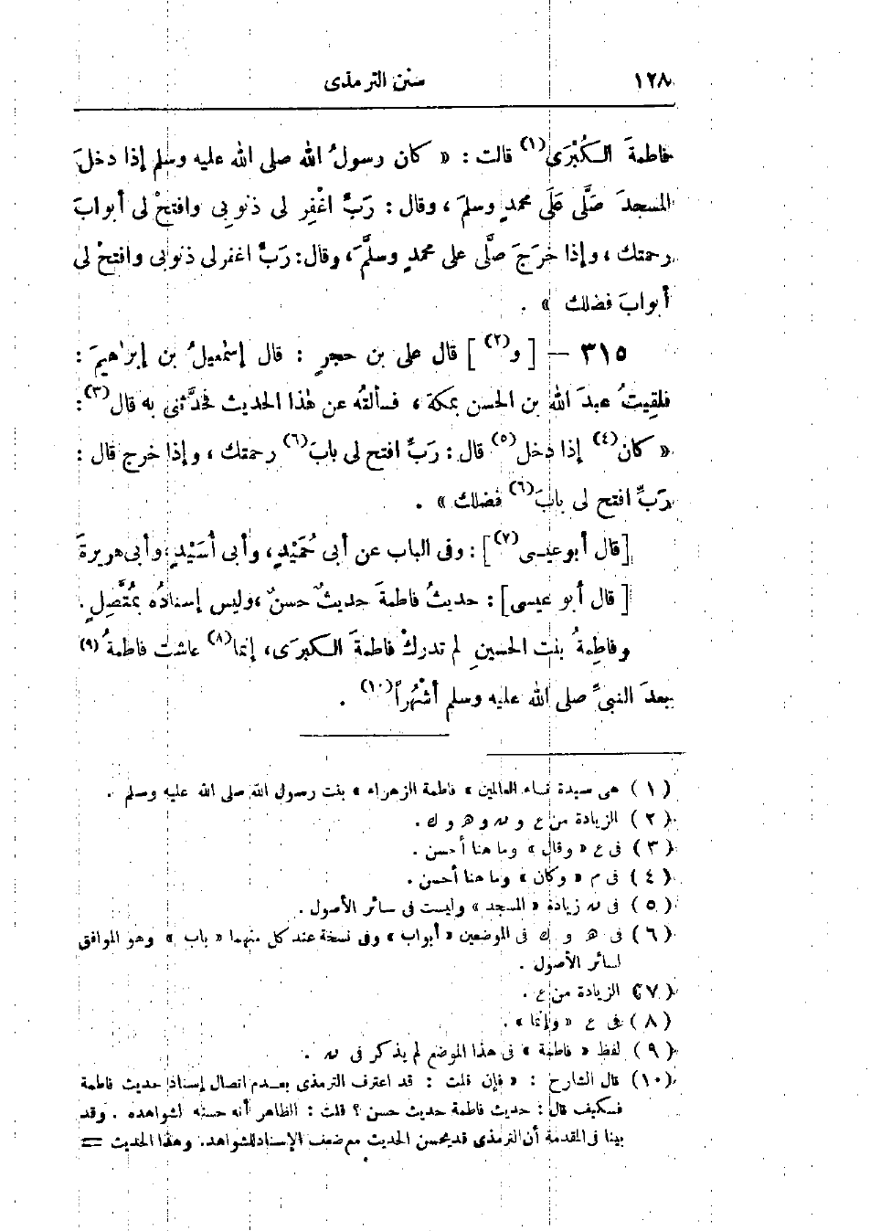 315 - وقَالَ عَلِيُّ بْنُ حُجْرٍ: قَالَ إِسْمَاعِيلُ بْنُ إِبْرَاهِيمَ: فَلَقِيتُ عَبْدَ اللَّهِ بْنَ الحَسَنِ بِمَكَّةَ، فَسَأَلْتُهُ عَنْ هَذَا الحَدِيثِ فَحَدَّثَنِي بِهِ، قَالَ: كَانَ إِذَا دَخَلَ قَالَ: «رَبِّ افْتَحْ لِي بَابَ رَحْمَتِكَ»، وَإِذَا خَرَجَ قَالَ: «رَبِّ افْتَحْ لِي بَابَ فَضْلِكَ»،: وَفِي البَابِ عَنْ أَبِي حُمَيْدٍ، وَأَبِي أُسَيْدٍ، وَأَبِي هُرَيْرَةَ،: «حَدِيثُ فَاطِمَةَ حَدِيثٌ حَسَنٌ، وَلَيْسَ إِسْنَادُهُ بِمُتَّصِلٍ»، «وَفَاطِمَةُ بِنْتُ الحُسَيْنِ لَمْ تُدْرِكْ فَاطِمَةَ الكُبْرَى إِنَّمَا عَاشَتْ فَاطِمَةُ بَعْدَ النَّبِيِّ صَلَّى اللَّهُ عَلَيْهِ وَسَلَّمَ أَشْهُرًا»