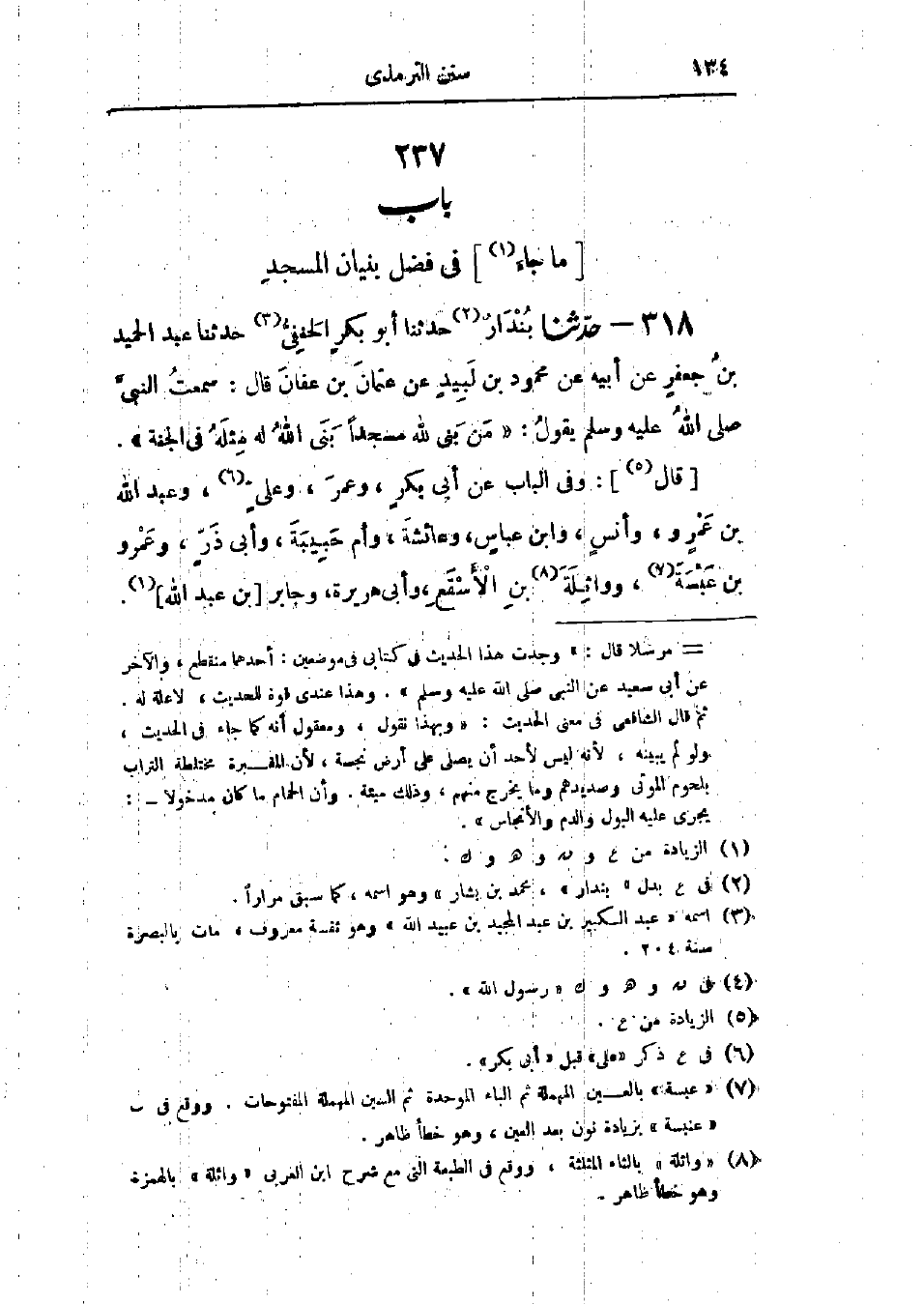 318 - حَدَّثَنَا بُنْدَارٌ قَالَ: حَدَّثَنَا أَبُو بَكْرٍ الحَنَفِيُّ قَالَ: حَدَّثَنَا عَبْدُ الحَمِيدِ بْنُ جَعْفَرٍ، عَنْ أَبِيهِ، عَنْ مَحْمُودِ بْنِ لَبِيدٍ، عَنْ عُثْمَانَ بْنِ عَفَّانَ، قَالَ: سَمِعْتُ النَّبِيَّ صَلَّى اللَّهُ عَلَيْهِ وَسَلَّمَ يَقُولُ: «§مَنْ بَنَى لِلَّهِ مَسْجِدًا بَنَى اللَّهُ لَهُ مِثْلَهُ فِي الجَنَّةِ»، وَفِي البَابِ عَنْ أَبِي بَكْرٍ، وَعُمَرَ، وَعَلِيٍّ، وَعَبْدِ اللَّهِ بْنِ عَمْرٍو، وَأَنَسٍ، وَابْنِ عَبَّاسٍ، وَعَائِشَةَ، وَأُمِّ حَبِيبَةَ، وَأَبِي ذَرٍّ، وَعَمْرِو بْنِ عَبَسَةَ، وَوَاثِلَةَ بْنِ الأَسْقَعِ، وَأَبِي هُرَيْرَةَ، وَجَابِرِ بْنِ عَبْدِ اللَّهِ،: -[135]- «حَدِيثُ عُثْمَانَ حَدِيثٌ حَسَنٌ صَحِيحٌ»، «وَمَحْمُودُ بْنُ لَبِيدٍ قَدْ أَدْرَكَ النَّبِيَّ صَلَّى اللَّهُ عَلَيْهِ وَسَلَّمَ، وَمَحْمُودُ بْنُ الرَّبِيعِ، قَدْ رَأَى النَّبِيَّ صَلَّى اللَّهُ عَلَيْهِ وَسَلَّمَ وَهُمَا غُلَامَانِ صَغِيرَانِ مَدَنِيَّانِ»
