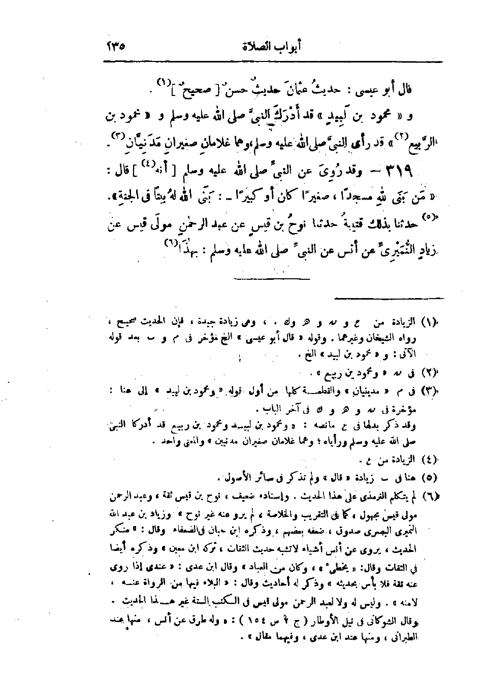 319 - وَقَدْ رُوِيَ عَنِ النَّبِيِّ صَلَّى اللَّهُ عَلَيْهِ وَسَلَّمَ قَالَ: «§مَنْ بَنَى لِلَّهِ مَسْجِدًا صَغِيرًا كَانَ أَوْ كَبِيرًا بَنَى اللَّهُ لَهُ بَيْتًا فِي الجَنَّةِ»، حَدَّثَنَا بِذَلِكَ قُتَيْبَةُ قَالَ: حَدَّثَنَا نُوحُ بْنُ قَيْسٍ، عَنْ عَبْدِ الرَّحْمَنِ، مَوْلَى قَيْسٍ، عَنْ زِيَادٍ النُّمَيْرِيِّ، عَنْ أَنَسٍ، عَنِ النَّبِيِّ صَلَّى اللَّهُ عَلَيْهِ وَسَلَّمَ بِهَذَا