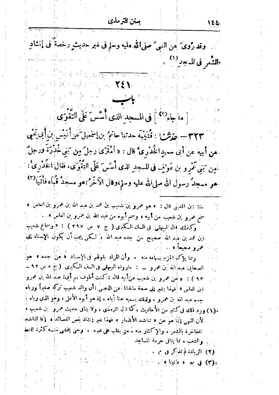323 - حَدَّثَنَا قُتَيْبَةُ قَالَ: حَدَّثَنَا حَاتِمُ بْنُ إِسْمَاعِيلَ، عَنْ أُنَيْسِ بْنِ أَبِي يَحْيَى، عَنْ أَبِيهِ، عَنْ أَبِي سَعِيدٍ الخُدْرِيِّ، قَالَ: امْتَرَى رَجُلٌ مِنْ بَنِي خُدْرَةَ وَرَجُلٌ مِنْ بَنِي عَمْرِو بْنِ عَوْفٍ فِي المَسْجِدِ الَّذِي أُسِّسَ عَلَى التَّقْوَى، فَقَالَ الخُدْرِيُّ: هُوَ مَسْجِدُ رَسُولِ اللَّهِ صَلَّى اللَّهُ عَلَيْهِ وَسَلَّمَ، وَقَالَ الآخَرُ: هُوَ مَسْجِدُ قُبَاءٍ، فَأَتَيَا -[145]- رَسُولَ اللَّهِ صَلَّى اللَّهُ عَلَيْهِ وَسَلَّمَ فِي ذَلِكَ فَقَالَ: «§هُوَ هَذَا - يَعْنِي مَسْجِدَهُ - وَفِي ذَلِكَ خَيْرٌ كَثِيرٌ»،: «هَذَا حَدِيثٌ حَسَنٌ صَحِيحٌ»، حَدَّثَنَا أَبُو بَكْرٍ، عَنْ عَلِيِّ بْنِ عَبْدِ اللَّهِ قَالَ: سَأَلْتُ يَحْيَى بْنَ سَعِيدٍ، عَنْ مُحَمَّدِ بْنِ أَبِي يَحْيَى الأَسْلَمِيِّ، فَقَالَ: لَمْ يَكُنْ بِهِ بَأْسٌ، وَأَخُوهُ أُنَيْسُ بْنُ أَبِي يَحْيَى أَثْبَتُ مِنْهُ