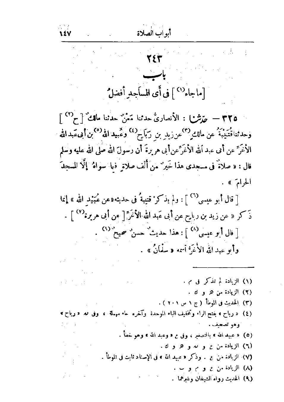 325 - حَدَّثَنَا الأَنْصَارِيُّ قَالَ: حَدَّثَنَا مَعْنٌ قَالَ: حَدَّثَنَا مَالِكٌ، ح وحَدَّثَنَا قُتَيْبَةُ، عَنْ مَالِكٍ، عَنْ زَيْدِ بْنِ رَبَاحٍ، وَعُبَيْدِ اللَّهِ بْنِ أَبِي عَبْدِ اللَّهِ الأَغَرِّ، عَنْ أَبِي عَبْدِ اللَّهِ الأَغَرِّ، عَنْ أَبِي هُرَيْرَةَ، أَنَّ رَسُولَ اللَّهِ صَلَّى اللَّهُ عَلَيْهِ وَسَلَّمَ قَالَ: «§صَلَاةٌ فِي مَسْجِدِي هَذَا خَيْرٌ مِنْ أَلْفِ صَلَاةٍ فِيمَا سِوَاهُ، إِلَّا المَسْجِدَ الحَرَامَ»،: " وَلَمْ يَذْكُرْ قُتَيْبَةُ فِي حَدِيثِهِ، عَنْ عُبَيْدِ اللَّهِ، إِنَّمَا ذَكَرَ عَنْ زَيْدِ بْنِ رَبَاحٍ، عَنْ أَبِي عَبْدِ اللَّهِ الْأَغَرِّ،: «هَذَا حَدِيثٌ حَسَنٌ صَحِيحٌ»، «وَأَبُو عَبْدِ اللَّهِ الأَغَرُّ اسْمُهُ سَلْمَانُ»، -[148]- «وَقَدْ رُوِيَ عَنْ أَبِي هُرَيْرَةَ مِنْ غَيْرِ وَجْهٍ عَنِ النَّبِيِّ صَلَّى اللَّهُ عَلَيْهِ وَسَلَّمَ» وَفِي البَابِ عَنْ عَلِيٍّ، وَمَيْمُونَةَ، وَأَبِي سَعِيدٍ، وَجُبَيْرِ بْنِ مُطْعِمٍ، وَابْنِ عُمَرَ، وَعَبْدِ اللَّهِ بْنِ الزُّبَيْرِ، وَأَبِي ذَرٍّ