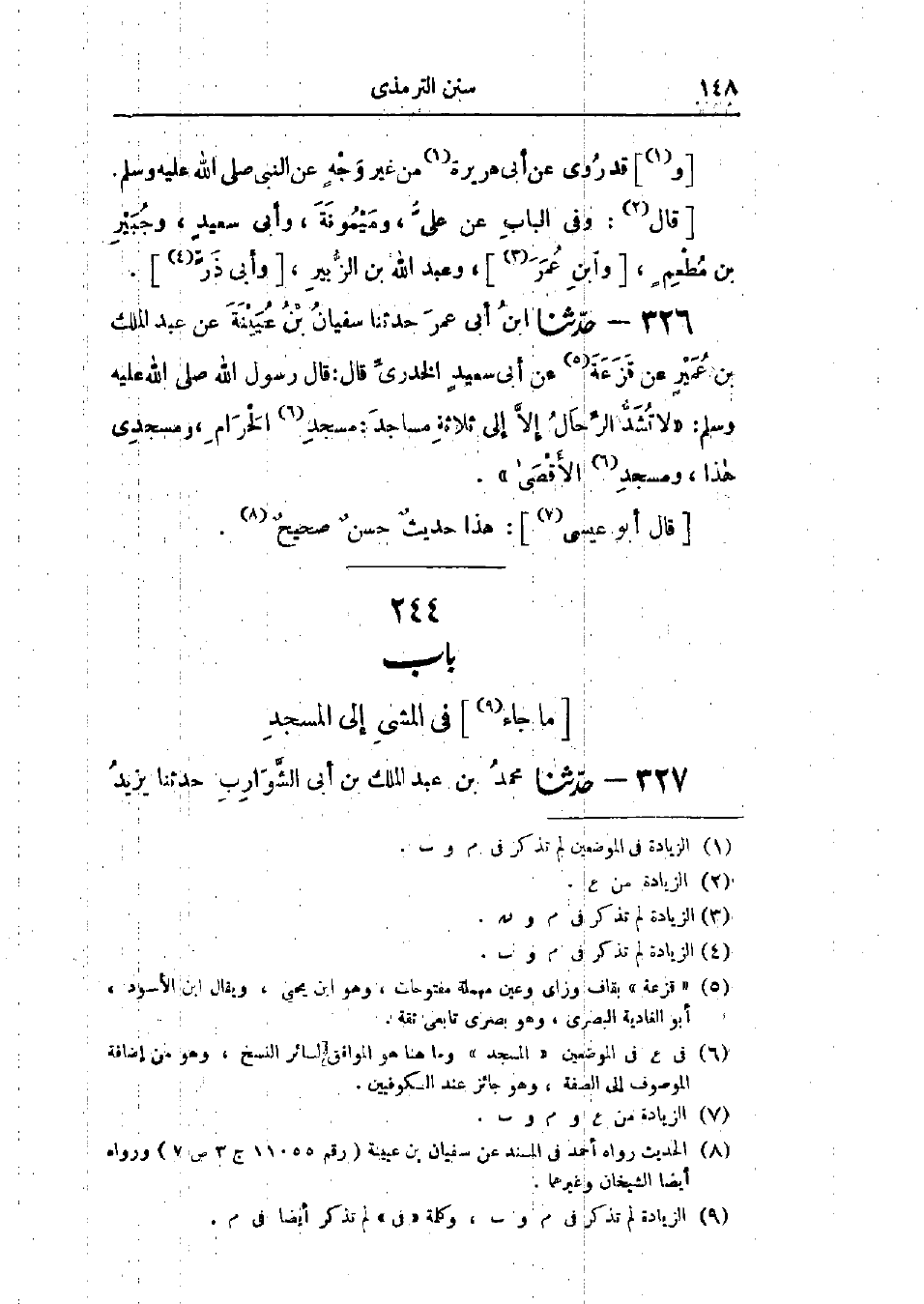 326 - حَدَّثَنَا ابْنُ أَبِي عُمَرَ قَالَ: حَدَّثَنَا سُفْيَانُ بْنُ عُيَيْنَةَ، عَنْ عَبْدِ المَلِكِ بْنِ عُمَيْرٍ، عَنْ قَزَعَةَ، عَنْ أَبِي سَعِيدٍ الخُدْرِيِّ، قَالَ: قَالَ رَسُولُ اللَّهِ صَلَّى اللَّهُ عَلَيْهِ وَسَلَّمَ: " §لَا تُشَدُّ الرِّحَالُ إِلَّا إِلَى ثَلَاثَةِ مَسَاجِدَ: مَسْجِدِ الحَرَامِ، وَمَسْجِدِي هَذَا، وَمَسْجِدِ الأَقْصَى «،» هَذَا حَدِيثٌ حَسَنٌ صَحِيحٌ "