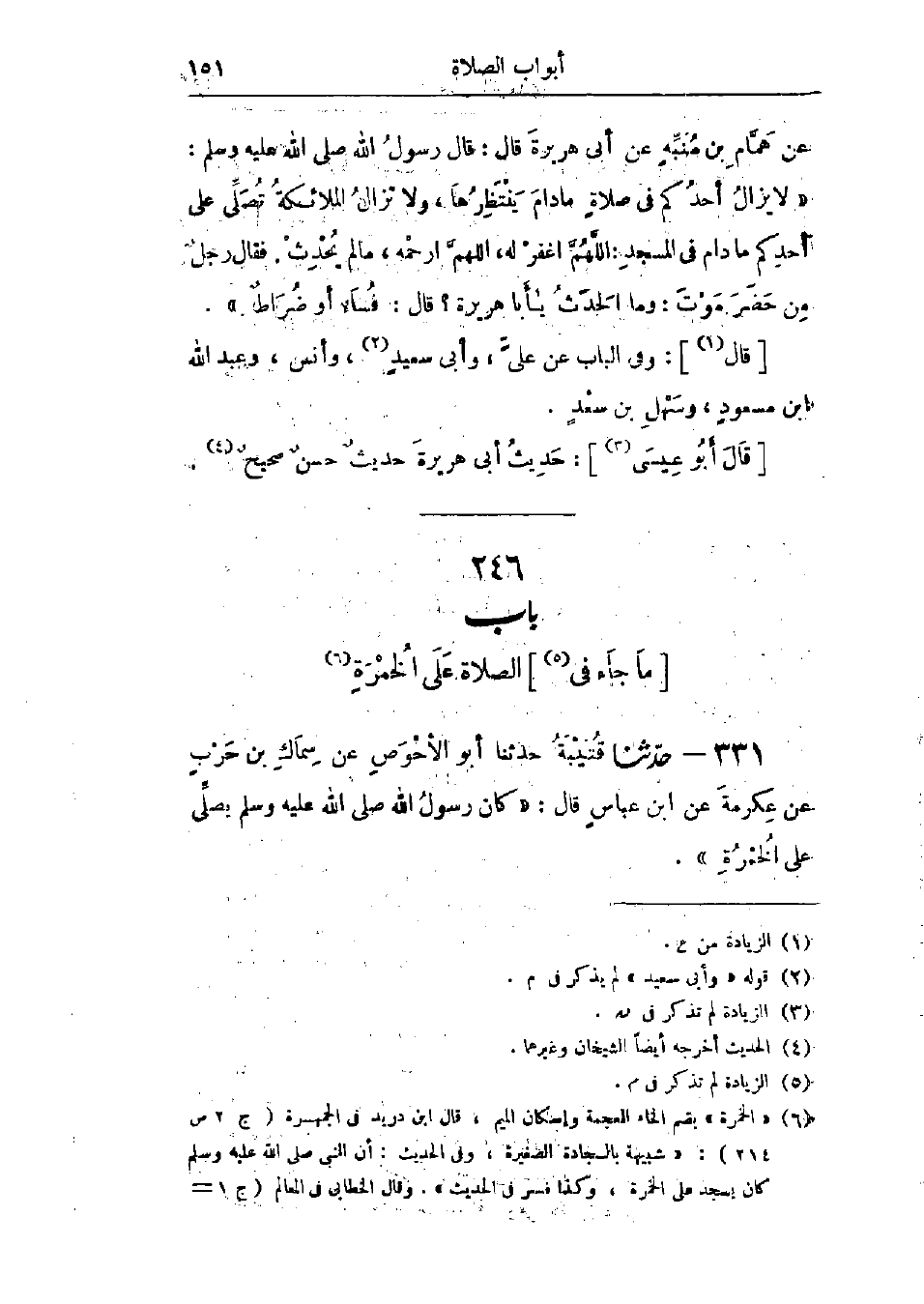 331 - حَدَّثَنَا قُتَيْبَةُ قَالَ: حَدَّثَنَا أَبُو الأَحْوَصِ، عَنْ سِمَاكِ بْنِ حَرْبٍ، عَنْ عِكْرِمَةَ، عَنْ ابْنِ عَبَّاسٍ قَالَ: «كَانَ رَسُولُ اللَّهِ صَلَّى اللَّهُ عَلَيْهِ وَسَلَّمَ §يُصَلِّي عَلَى الخُمْرَةِ»، -[152]- وَفِي البَابِ عَنْ أُمِّ حَبِيبَةَ، وَابْنِ عُمَرَ، وَأُمِّ سَلَمَةَ، وَعَائِشَةَ، وَمَيْمُونَةَ، وَأُمِّ كُلْثُومٍ بِنْتِ أَبِي سَلَمَةَ بْنِ عَبْدِ الأَسَدِ وَلَمْ تَسْمَعْ مِنَ النَّبِيِّ صَلَّى اللَّهُ عَلَيْهِ وَسَلَّمَ «حَدِيثُ ابْنِ عَبَّاسٍ حَدِيثٌ حَسَنٌ صَحِيحٌ»، «وَبِهِ يَقُولُ بَعْضُ أَهْلِ العِلْمِ»، وقَالَ أَحْمَدُ، وَإِسْحَاقُ: «قَدْ ثَبَتَ عَنِ النَّبِيِّ صَلَّى اللَّهُ عَلَيْهِ وَسَلَّمَ الصَّلَاةُ عَلَى الخُمْرَةِ»،: -[153]- " وَالخُمْرَةُ: هُوَ حَصِيرٌ قَصِيرٌ "
