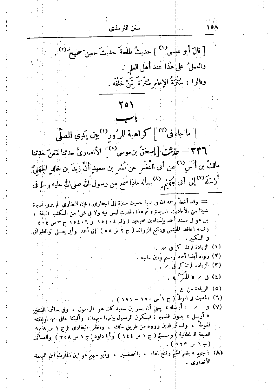 336 - حَدَّثَنَا الْأَنْصَارِيُّ قَالَ: حَدَّثَنَا مَعْنٌ قَالَ: حَدَّثَنَا مَالِكُ بْنُ أَنَسٍ، عَنْ أَبِي النَّضْرِ، عَنْ بُسْرِ بْنِ سَعِيدٍ، أَنَّ زَيْدَ بْنَ خَالِدٍ الجُهَنِيَّ، أَرْسَلَ إِلَى أَبِي جُهَيْمٍ يَسْأَلُهُ مَاذَا سَمِعَ مِنْ رَسُولِ اللَّهِ صَلَّى اللَّهُ عَلَيْهِ وَسَلَّمَ فِي -[159]- المَارِّ بَيْنَ يَدَيِ المُصَلِّي؟ فَقَالَ أَبُو جُهَيْمٍ: قَالَ رَسُولُ اللَّهِ صَلَّى اللَّهُ عَلَيْهِ وَسَلَّمَ: «§لَوْ يَعْلَمُ المَارُّ بَيْنَ يَدَيِ المُصَلِّي مَاذَا عَلَيْهِ، لَكَانَ أَنْ يَقِفَ أَرْبَعِينَ خَيْرٌ لَهُ مِنْ أَنْ يَمُرَّ بَيْنَ يَدَيْهِ»، قَالَ أَبُو النَّضْرِ: لَا أَدْرِي قَالَ: «أَرْبَعِينَ يَوْمًا»، أَوْ «أَرْبَعِينَ شَهْرًا»، أَوْ «أَرْبَعِينَ سَنَةً»،: وَفِي البَابِ عَنْ أَبِي سَعِيدٍ الخُدْرِيِّ، وَأَبِي هُرَيْرَةَ، وَابْنِ عُمَرَ، وَعَبْدِ اللَّهِ بْنِ عَمْرٍو،: «وَحَدِيثُ أَبِي جُهَيْمٍ حَدِيثٌ حَسَنٌ صَحِيحٌ» -[160]- وَقَدْ رُوِيَ عَنِ النَّبِيِّ صَلَّى اللَّهُ عَلَيْهِ وَسَلَّمَ أَنَّهُ قَالَ: «لَأَنْ يَقِفَ أَحَدُكُمْ مِائَةَ عَامٍ خَيْرٌ لَهُ مِنْ أَنْ يَمُرَّ بَيْنَ يَدَيْ أَخِيهِ وَهُوَ يُصَلِّي» وَالعَمَلُ عَلَيْهِ عِنْدَ أَهْلِ العِلْمِ: كَرِهُوا المُرُورَ بَيْنَ يَدَيِ المُصَلِّي، وَلَمْ يَرَوْا أَنَّ ذَلِكَ يَقْطَعُ صَلَاةَ الرَّجُلِ «وَاسْمُ أَبِي النَّضْرِ، سَالِمٌ مَوْلَى عُمَرَ بْنِ عُبَيْدِ اللَّهِ المَدِينِيِّ»