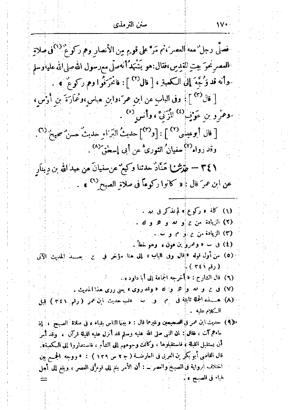 341 - حَدَّثَنَا هَنَّادٌ قَالَ: حَدَّثَنَا وَكِيعٌ، عَنْ سُفْيَانَ، عَنْ عَبْدِ اللَّهِ بْنِ دِينَارٍ، عَنْ ابْنِ عُمَرَ قَالَ: «كَانُوا رُكُوعًا فِي صَلَاةِ الصُّبْحِ»،: -[171]- «وَحَدِيثُ ابْنِ عُمَرَ حَدِيثٌ صَحِيحٌ»