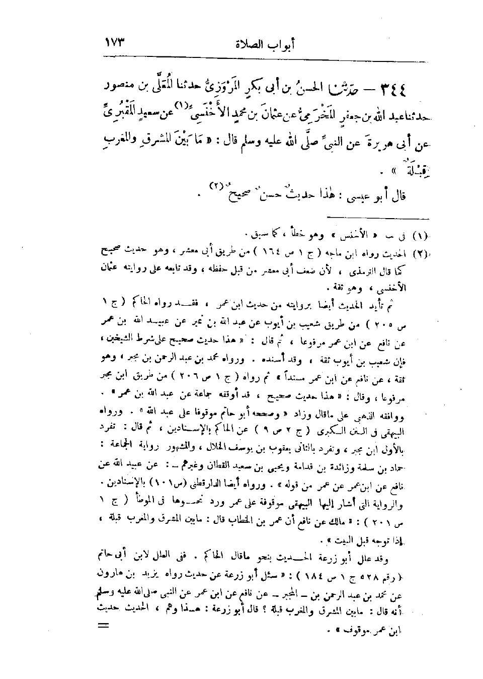 344 - حَدَّثَنَا الحَسَنُ بْنُ بَكْرٍ المَرْوَزِيُّ قَالَ: حَدَّثَنَا المُعَلَّى بْنُ مَنْصُورٍ قَالَ: حَدَّثَنَا عَبْدُ اللَّهِ بْنُ جَعْفَرٍ المَخْرَمِيُّ، عَنْ عُثْمَانَ بْنِ مُحَمَّدٍ الأَخْنَسِيِّ، عَنْ سَعِيدٍ المَقْبُرِيِّ، عَنْ أَبِي هُرَيْرَةَ، عَنِ النَّبِيِّ صَلَّى اللَّهُ عَلَيْهِ وَسَلَّمَ قَالَ: «§مَا بَيْنَ المَشْرِقِ وَالمَغْرِبِ قِبْلَةٌ»،: «هَذَا حَدِيثٌ حَسَنٌ صَحِيحٌ»، -[174]- وَإِنَّمَا قِيلَ عَبْدُ اللَّهِ بْنُ جَعْفَرٍ المَخْرَمِيُّ لِأَنَّهُ مِنْ وَلَدِ المِسْوَرِ بْنِ مَخْرَمَةَ، وَقَدْ رُوِيَ عَنْ غَيْرِ وَاحِدٍ مِنْ أَصْحَابِ النَّبِيِّ صَلَّى اللَّهُ عَلَيْهِ وَسَلَّمَ: «مَا بَيْنَ المَشْرِقِ وَالمَغْرِبِ قِبْلَةٌ»، مِنْهُمْ عُمَرُ بْنُ الخَطَّابِ، وَعَلِيُّ بْنُ أَبِي طَالِبٍ، وَابْنُ عَبَّاسٍ وقَالَ ابْنُ عُمَرَ: «إِذَا جَعَلْتَ المَغْرِبَ عَنْ يَمِينِكَ، وَالمَشْرِقَ عَنْ يَسَارِكَ فَمَا بَيْنَهُمَا قِبْلَةٌ، إِذَا اسْتَقْبَلْتَ القِبْلَةَ -[175]-» وقَالَ ابْنُ المُبَارَكِ: «مَا بَيْنَ المَشْرِقِ وَالمَغْرِبِ قِبْلَةٌ، هَذَا لِأَهْلِ المَشْرِقِ»، وَاخْتَارَ عَبْدُ اللَّهِ بْنُ المُبَارَكِ التَّيَاسُرَ لِأَهْلِ مَرْوٍ