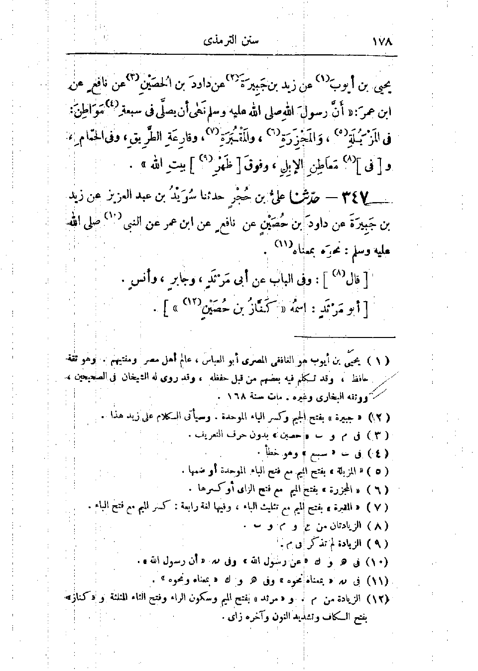 347 - حَدَّثَنَا عَلِيُّ بْنُ حُجْرٍ قَالَ: حَدَّثَنَا سُوَيْدُ بْنُ عَبْدِ العَزِيزِ، عَنْ زَيْدِ بْنِ جَبِيرَةَ، عَنْ دَاوُدَ بْنِ حُصَيْنٍ، عَنْ نَافِعٍ، عَنْ ابْنِ عُمَرَ، عَنْ رَسُولِ اللَّهِ صَلَّى اللَّهُ عَلَيْهِ وَسَلَّمَ، بِمَعْنَاهُ نَحْوَهُ، وَفِي البَابِ عَنْ أَبِي مَرْثَدٍ، وَجَابِرٍ، وَأَنَسٍ، -[179]- حَدِيثُ ابْنِ عُمَرَ إِسْنَادُهُ لَيْسَ بِذَاكَ القَوِيِّ، وَقَدْ تُكُلِّمَ فِي زَيْدِ بْنِ جَبِيرَةَ مِنْ قِبَلِ حِفْظِهِ «، وَقَدْ رَوَى اللَّيْثُ بْنُ سَعْدٍ هَذَا الحَدِيثَ، عَنْ عَبْدِ اللَّهِ بْنِ عُمَرَ العُمَرِيِّ، عَنْ نَافِعٍ، عَنْ ابْنِ عُمَرَ، عَنْ عُمَرَ، عَنِ النَّبِيِّ صَلَّى اللَّهُ عَلَيْهِ وَسَلَّمَ، مِثْلَهُ،» وَحَدِيثُ ابْنِ عُمَرَ، عَنِ النَّبِيِّ صَلَّى اللَّهُ عَلَيْهِ وَسَلَّمَ أَشْبَهُ وَأَصَحُّ مِنْ حَدِيثِ اللَّيْثِ بْنِ سَعْدٍ «،» وَعَبْدُ اللَّهِ بْنُ عُمَرَ العُمَرِيُّ ضَعَّفَهُ بَعْضُ أَهْلِ الحَدِيثِ مِنْ قِبَلِ حِفْظِهِ مِنْهُمْ: يَحْيَى بْنُ سَعِيدٍ القَطَّانُ "