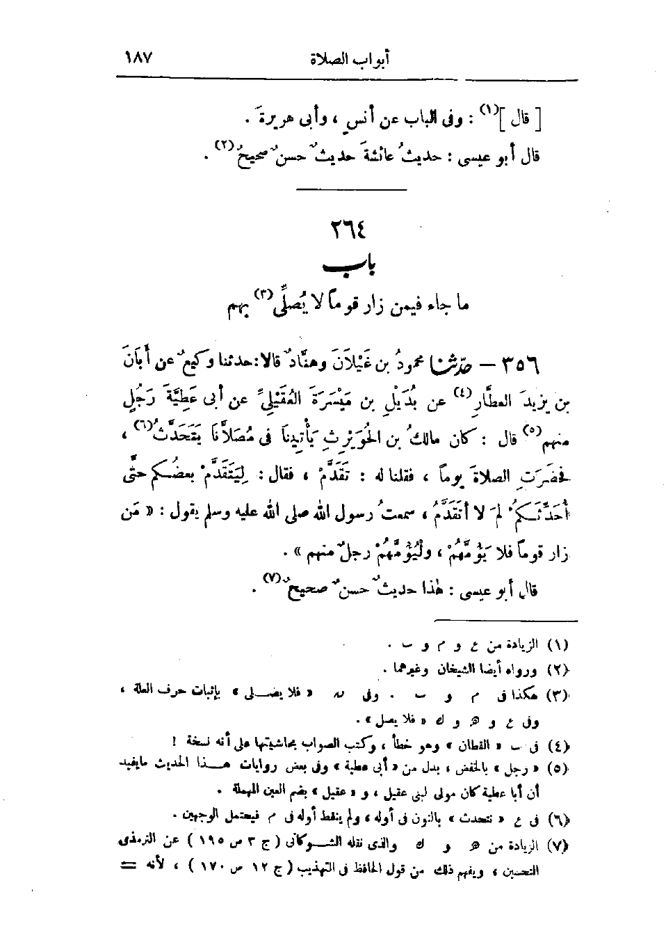 356 - حَدَّثَنَا مَحْمُودُ بْنُ غَيْلَانَ، وَهَنَّادٌ، قَالَا: حَدَّثَنَا وَكِيعٌ، عَنْ أَبَانَ بْنِ يَزِيدَ العَطَّارِ، عَنْ بُدَيْلِ بْنِ مَيْسَرَةَ العُقَيْلِيِّ، عَنْ أَبِي عَطِيَّةَ، رَجُلٍ مِنْهُمْ قَالَ: كَانَ مَالِكُ بْنُ الحُوَيْرِثِ يَأْتِينَا فِي مُصَلَّانَا يَتَحَدَّثُ، فَحَضَرَتِ الصَّلَاةُ يَوْمًا، فَقُلْنَا لَهُ: تَقَدَّمْ، فَقَالَ: لِيَتَقَدَّمْ بَعْضُكُمْ حَتَّى أُحَدِّثَكُمْ لِمَ لَا أَتَقَدَّمُ، سَمِعْتُ رَسُولَ اللَّهِ صَلَّى اللَّهُ عَلَيْهِ وَسَلَّمَ يَقُولُ: «§مَنْ زَارَ قَوْمًا فَلَا يَؤُمَّهُمْ، وَلْيَؤُمَّهُمْ رَجُلٌ مِنْهُمْ»: " هَذَا حَدِيثٌ حَسَنٌ صَحِيحٌ -[188]- وَالعَمَلُ عَلَى هَذَا عِنْدَ أَكْثَرِ أَهْلِ العِلْمِ مِنْ أَصْحَابِ النَّبِيِّ صَلَّى اللَّهُ عَلَيْهِ وَسَلَّمَ وَغَيْرِهِمْ قَالُوا: صَاحِبُ المَنْزِلِ أَحَقُّ بِالإِمَامَةِ مِنَ الزَّائِرِ «،» وقَالَ بَعْضُ أَهْلِ العِلْمِ: إِذَا أَذِنَ لَهُ فَلَا بَأْسَ أَنْ يُصَلِّيَ بِهِ «،» وقَالَ إِسْحَاقُ بِحَدِيثِ مَالِكِ بْنِ الحُوَيْرِثِ، وَشَدَّدَ فِي أَنْ لَا يُصَلِّيَ أَحَدٌ بِصَاحِبِ المَنْزِلِ، وَإِنْ أَذِنَ لَهُ صَاحِبُ المَنْزِلِ " قَالَ: " وَكَذَلِكَ فِي المَسْجِدِ، لَا يُصَلِّي بِهِمْ فِي المَسْجِدِ إِذَا زَارَهُمْ، يَقُولُ: يُصَلِّي بِهِمْ رَجُلٌ مِنْهُمْ "