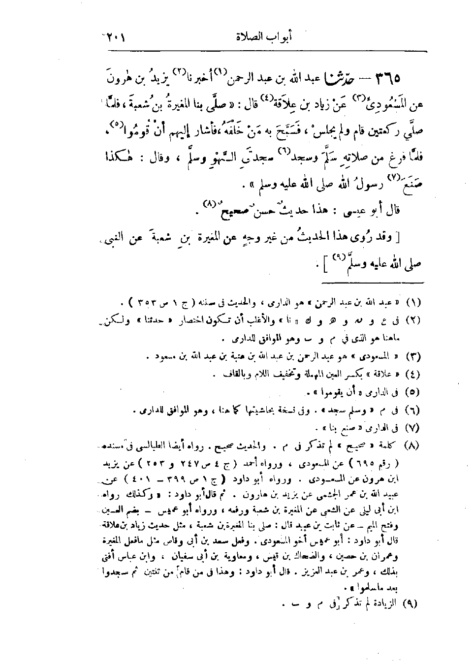 365 - حَدَّثَنَا عَبْدُ اللَّهِ بْنُ عَبْدِ الرَّحْمَنِ قَالَ: أَخْبَرَنَا يَزِيدُ بْنُ هَارُونَ، عَنْ المَسْعُودِيِّ، عَنْ زِيَادِ بْنِ عِلَاقَةَ، قَالَ: صَلَّى بِنَا المُغِيرَةُ بْنُ شُعْبَةَ §فَلَمَّا صَلَّى رَكْعَتَيْنِ قَامَ وَلَمْ يَجْلِسْ، فَسَبَّحَ بِهِ مَنْ خَلْفَهُ، فَأَشَارَ إِلَيْهِمْ أَنْ قُومُوا، فَلَمَّا فَرَغَ مِنْ صَلَاتِهِ سَلَّمَ وَسَجَدَ سَجْدَتَيِ السَّهْوِ وَسَلَّمَ، وَقَالَ: «هَكَذَا صَنَعَ رَسُولُ اللَّهِ صَلَّى اللَّهُ عَلَيْهِ وَسَلَّمَ»،: «هَذَا حَدِيثٌ حَسَنٌ صَحِيحٌ، وَقَدْ رُوِيَ هَذَا الحَدِيثُ مِنْ غَيْرِ وَجْهٍ عَنِ المُغِيرَةِ بْنِ شُعْبَةَ عَنِ النَّبِيِّ صَلَّى اللَّهُ عَلَيْهِ وَسَلَّمَ»