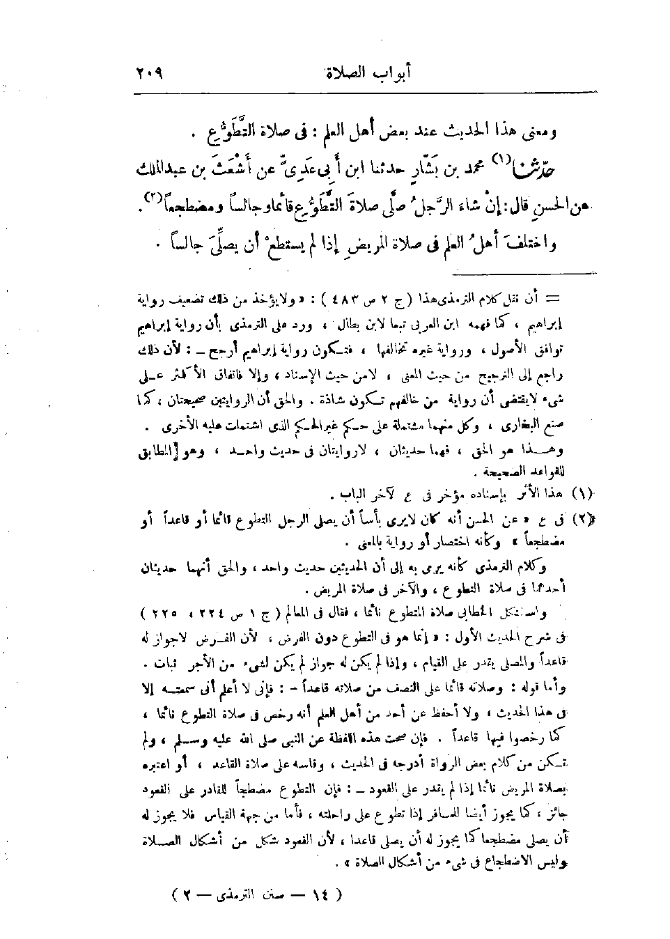 حَدَّثَنَا مُحَمَّدُ بْنُ بَشَّارٍ قَالَ: حَدَّثَنَا ابْنُ أَبِي عَدِيٍّ، عَنْ أَشْعَثَ بْنِ عَبْدِ المَلِكِ، عَنِ الحَسَنِ، قَالَ: «§إِنْ شَاءَ الرَّجُلُ صَلَّى صَلَاةَ التَّطَوُّعِ قَائِمًا، وَجَالِسًا، وَمُضْطَجِعًا»، " وَاخْتَلَفَ أَهْلُ العِلْمِ فِي صَلَاةِ المَرِيضِ إِذَا لَمْ يَسْتَطِعْ أَنْ يُصَلِّيَ جَالِسًا، -[210]- فَقَالَ بَعْضُ أَهْلِ العِلْمِ: إِنَّهُ يُصَلِّي عَلَى جَنْبِهِ الأَيْمَنِ، وقَالَ بَعْضُهُمْ: يُصَلِّي مُسْتَلْقِيًا عَلَى قَفَاهُ وَرِجْلَاهُ إِلَى القِبْلَةِ " وَقَالَ سُفْيَانُ الثَّوْرِيُّ: فِي هَذَا الحَدِيثِ: «مَنْ صَلَّى جَالِسًا فَلَهُ نِصْفُ أَجْرِ القَائِمِ» قَالَ: هَذَا لِلصَّحِيحِ وَلِمَنْ لَيْسَ لَهُ عُذْرٌ، فَأَمَّا مَنْ كَانَ لَهُ عُذْرٌ مِنْ مَرَضٍ أَوْ غَيْرِهِ فَصَلَّى جَالِسًا فَلَهُ مِثْلُ أَجْرِ القَائِمِ «،» وَقَدْ رُوِيَ فِي بَعْضِ هَذَا الحَدِيثِ مِثْلُ قَوْلِ سُفْيَانَ الثَّوْرِيِّ "