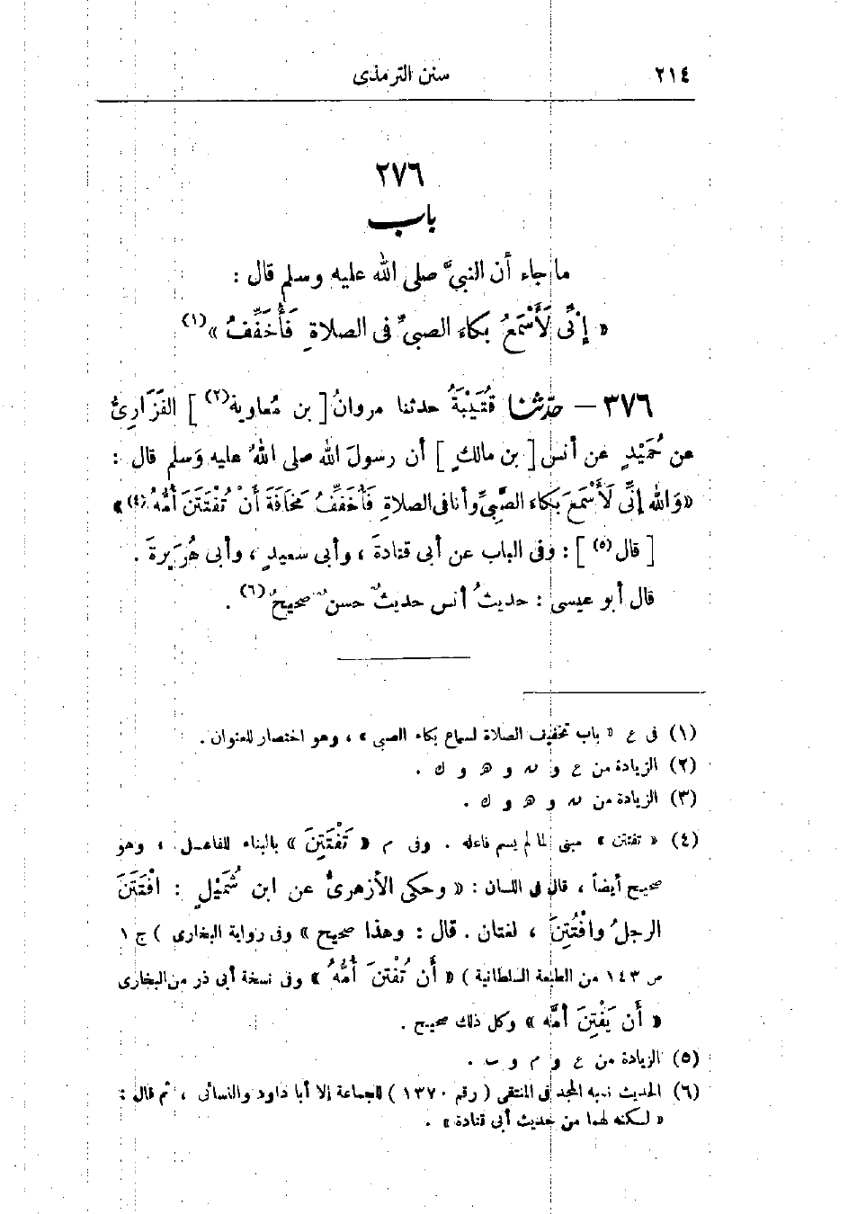 376 - حَدَّثَنَا قُتَيْبَةُ قَالَ: حَدَّثَنَا مَرْوَانُ بْنُ مُعَاوِيَةَ الفَزَارِيُّ، عَنْ حُمَيْدٍ، عَنْ أَنَسِ بْنِ مَالِكٍ، أَنَّ رَسُولَ اللَّهِ صَلَّى اللَّهُ عَلَيْهِ وَسَلَّمَ قَالَ: «وَاللَّهِ §إِنِّي لَأَسْمَعُ بُكَاءَ الصَّبِيِّ وَأَنَا فِي الصَّلَاةِ فَأُخَفِّفُ، مَخَافَةَ أَنْ تُفْتَتَنَ أُمُّهُ»، وَفِي البَابِ عَنْ أَبِي قَتَادَةَ، وَأَبِي سَعِيدٍ، وَأَبِي هُرَيْرَةَ،: «حَدِيثُ أَنَسٍ حَدِيثٌ حَسَنٌ صَحِيحٌ»