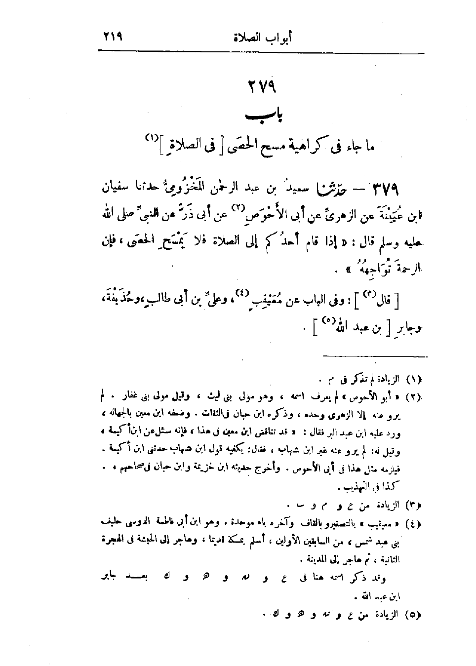 379 - حَدَّثَنَا سَعِيدُ بْنُ عَبْدِ الرَّحْمَنِ المَخْزُومِيُّ قَالَ: حَدَّثَنَا سُفْيَانُ بْنُ عُيَيْنَةَ، عَنْ الزُّهْرِيِّ، عَنْ أَبِي الأَحْوَصِ، عَنْ أَبِي ذَرٍّ، عَنِ النَّبِيِّ صَلَّى اللَّهُ عَلَيْهِ وَسَلَّمَ قَالَ: «§إِذَا قَامَ أَحَدُكُمْ إِلَى الصَّلَاةِ فَلَا يَمْسَحِ الحَصَى، فَإِنَّ الرَّحْمَةَ تُوَاجِهُهُ»، وَفِي البَابِ عَنْ مُعَيْقِيبٍ، وَعَلِيِّ بْنِ أَبِي طَالِبٍ، وَحُذَيْفَةَ، وَجَابِرِ بْنِ عَبْدِ اللَّهِ،: -[220]- «حَدِيثُ أَبِي ذَرٍّ حَدِيثٌ حَسَنٌ» وَقَدْ رُوِيَ عَنِ النَّبِيِّ صَلَّى اللَّهُ عَلَيْهِ وَسَلَّمَ أَنَّهُ كَرِهَ المَسْحَ فِي الصَّلَاةِ، وَقَالَ: «إِنْ كُنْتَ لَا بُدَّ فَاعِلًا فَمَرَّةً وَاحِدَةً» كَأَنَّهُ رُوِيَ عَنْهُ رُخْصَةٌ فِي المَرَّةِ الوَاحِدَةِ، وَالعَمَلُ عَلَى هَذَا عِنْدَ أَهْلِ العِلْمِ "