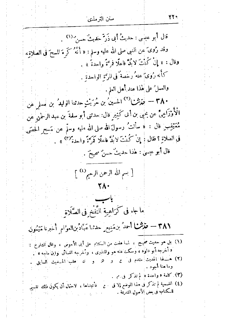 380 - حَدَّثَنَا الحُسَيْنُ بْنُ حُرَيْثٍ قَالَ: حَدَّثَنَا الوَلِيدُ بْنُ مُسْلِمٍ، عَنْ الأَوْزَاعِيِّ، عَنْ يَحْيَى بْنِ أَبِي كَثِيرٍ، قَالَ: حَدَّثَنِي أَبُو سَلَمَةَ بْنُ عَبْدِ الرَّحْمَنِ، عَنْ مُعَيْقِيبٍ، قَالَ: سَأَلْتُ رَسُولَ اللَّهِ صَلَّى اللَّهُ عَلَيْهِ وَسَلَّمَ عَنْ §مَسْحِ الحَصَى فِي الصَّلَاةِ؟ فَقَالَ: «إِنْ كُنْتَ لَا بُدَّ فَاعِلًا فَمَرَّةً وَاحِدَةً»،: «هَذَا حَدِيثٌ حَسَنٌ صَحِيحٌ»