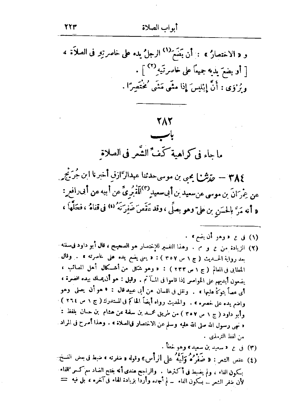 384 - حَدَّثَنَا يَحْيَى بْنُ مُوسَى قَالَ: حَدَّثَنَا عَبْدُ الرَّزَّاقِ قَالَ: أَخْبَرَنَا ابْنُ جُرَيْجٍ، عَنْ عِمْرَانَ بْنِ مُوسَى، عَنْ سَعِيدِ بْنِ أَبِي سَعِيدٍ المَقْبُرِيِّ، عَنْ أَبِيهِ، عَنْ أَبِي رَافِعٍ، أَنَّهُ مَرَّ بِالحَسَنِ بْنِ عَلِيٍّ وَهُوَ يُصَلِّي، وَقَدْ عَقَصَ ضَفِرَتَهُ فِي قَفَاهُ، فَحَلَّهَا، -[224]- فَالتَفَتَ إِلَيْهِ الحَسَنُ مُغْضَبًا، فَقَالَ: أَقْبِلْ عَلَى صَلَاتِكَ وَلَا تَغْضَبْ، فَإِنِّي سَمِعْتُ رَسُولَ اللَّهِ صَلَّى اللَّهُ عَلَيْهِ وَسَلَّمَ يَقُولُ: «§ذَلِكَ كِفْلُ الشَّيْطَانِ»، وَفِي البَابِ عَنْ أُمِّ سَلَمَةَ، وَعَبْدِ اللَّهِ بْنِ عَبَّاسٍ،: «حَدِيثُ أَبِي رَافِعٍ حَدِيثٌ حَسَنٌ» وَالعَمَلُ عَلَى هَذَا عِنْدَ أَهْلِ العِلْمِ: كَرِهُوا أَنْ يُصَلِّيَ الرَّجُلُ وَهُوَ مَعْقُوصٌ شَعْرُهُ "،: «وَعِمْرَانُ بْنُ مُوسَى هُوَ القُرَشِيُّ المَكِّيُّ وَهُوَ أَخُو أَيُّوبَ بْنِ مُوسَى»