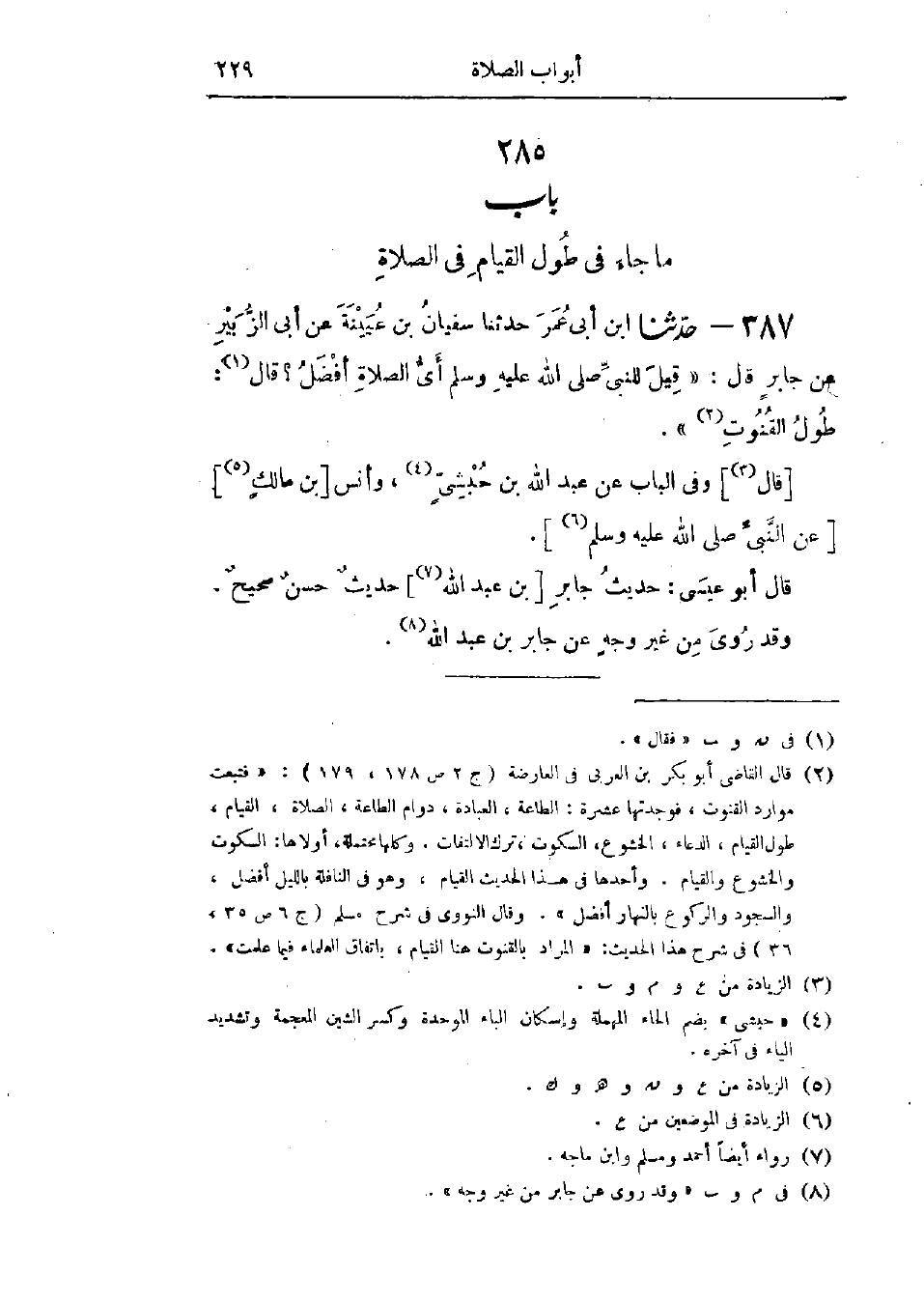 387 - حَدَّثَنَا ابْنُ أَبِي عُمَرَ قَالَ: حَدَّثَنَا سُفْيَانُ بْنُ عُيَيْنَةَ، عَنْ أَبِي الزُّبَيْرِ، عَنْ جَابِرٍ، قَالَ: قِيلَ لِلنَّبِيِّ صَلَّى اللَّهُ عَلَيْهِ وَسَلَّمَ §أَيُّ الصَّلَاةِ أَفْضَلُ؟ قَالَ: «طُولُ القُنُوتِ»، وَفِي البَابِ عَنْ عَبْدِ اللَّهِ بْنِ حُبْشِيٍّ، وَأَنَسِ بْنِ مَالِكٍ، «حَدِيثُ جَابِرٍ حَدِيثٌ حَسَنٌ صَحِيحٌ، وَقَدْ رُوِيَ مِنْ غَيْرِ وَجْهٍ، عَنْ جَابِرِ بْنِ عَبْدِ اللَّهِ»