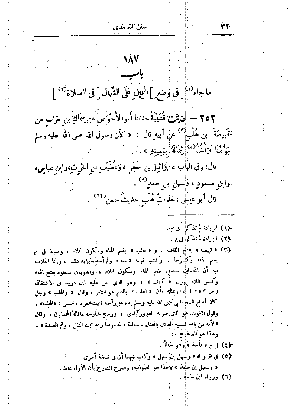 252 - حَدَّثَنَا قُتَيْبَةُ قَالَ: حَدَّثَنَا أَبُو الأَحْوَصِ، عَنْ سِمَاكِ بْنِ حَرْبٍ، عَنْ قَبِيصَةَ بْنِ هُلْبٍ، عَنْ أَبِيهِ، قَالَ: «كَانَ §رَسُولُ اللَّهِ صَلَّى اللَّهُ عَلَيْهِ وَسَلَّمَ يَؤُمُّنَا، فَيَأْخُذُ شِمَالَهُ بِيَمِينِهِ». وَفِي البَابِ عَنْ وَائِلِ بْنِ حُجْرٍ، وَغُطَيْفِ بْنِ الحَارِثِ، وَابْنِ عَبَّاسٍ، وَابْنِ مَسْعُودٍ، وَسَهْلِ بْنِ سَعْدٍ. حَدِيثُ هُلْبٍ حَدِيثٌ حَسَنٌ، -[33]- وَالعَمَلُ عَلَى هَذَا عِنْدَ أَهْلِ العِلْمِ مِنْ أَصْحَابِ النَّبِيِّ صَلَّى اللَّهُ عَلَيْهِ وَسَلَّمَ، وَالتَّابِعِينَ، وَمَنْ بَعْدَهُمْ، يَرَوْنَ أَنْ يَضَعَ الرَّجُلُ يَمِينَهُ عَلَى شِمَالِهِ فِي الصَّلَاةِ، وَرَأَى بَعْضُهُمْ أَنْ يَضَعَهُمَا فَوْقَ السُّرَّةِ، وَرَأَى بَعْضُهُمْ: أَنْ يَضَعَهُمَا تَحْتَ السُّرَّةِ، وَكُلُّ ذَلِكَ وَاسِعٌ عِنْدَهُمْ. وَاسْمُ هُلْبٍ: يَزِيدُ بْنُ قُنَافَةَ الطَّائِيُّ