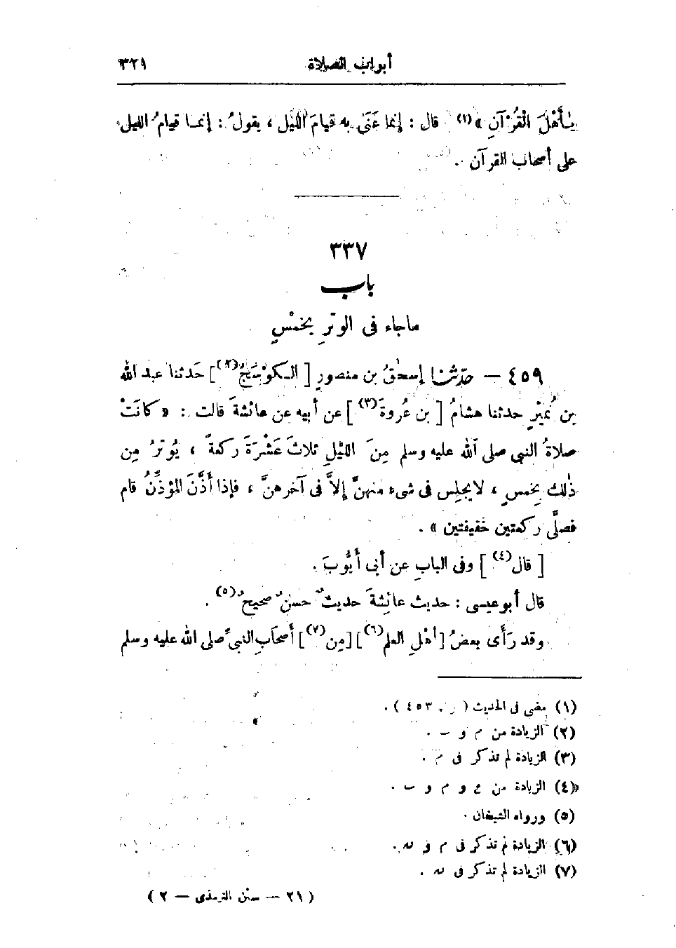 459 - حَدَّثَنَا إِسْحَاقُ بْنُ مَنْصُورٍ قَالَ: حَدَّثَنَا عَبْدُ اللَّهِ بْنُ نُمَيْرٍ قَالَ: حَدَّثَنَا هِشَامُ بْنُ عُرْوَةَ، عَنْ أَبِيهِ، عَنْ عَائِشَةَ، قَالَتْ: «كَانَتْ §صَلَاةُ النَّبِيِّ صَلَّى اللَّهُ عَلَيْهِ وَسَلَّمَ مِنَ اللَّيْلِ ثَلَاثَ عَشْرَةَ رَكْعَةً، يُوتِرُ مِنْ ذَلِكَ بِخَمْسٍ، لَا يَجْلِسُ فِي شَيْءٍ مِنْهُنَّ إِلَّا فِي آخِرِهِنَّ، فَإِذَا أَذَّنَ المُؤَذِّنُ قَامَ فَصَلَّى رَكْعَتَيْنِ خَفِيفَتَيْنِ» وَفِي البَابِ عَنْ أَبِي أَيُّوبَ: «حَدِيثُ عَائِشَةَ حَدِيثٌ حَسَنٌ صَحِيحٌ»، " وَقَدْ رَأَى بَعْضُ أَهْلِ العِلْمِ مِنْ أَصْحَابِ النَّبِيِّ صَلَّى اللَّهُ عَلَيْهِ وَسَلَّمَ -[322]- وَغَيْرِهِمُ الوِتْرَ بِخَمْسٍ، وَقَالُوا: لَا يَجْلِسُ فِي شَيْءٍ مِنْهُنَّ إِلَّا فِي آخِرِهِنَّ ": وَسَأَلْتُ أَبَا مُصْعَبٍ المَدِينِيَّ، عَنْ هَذَا الحَدِيثِ، كَانَ النَّبِيُّ صَلَّى اللَّهُ عَلَيْهِ وَسَلَّمَ يُوتِرُ بِالتِّسْعِ وَالسَّبْعِ، قُلْتُ: كَيْفَ يُوتِرُ بِالتِّسْعِ وَالسَّبْعِ؟ قَالَ: «يُصَلِّي مَثْنَى مَثْنَى، وَيُسَلِّمُ، وَيُوتِرُ بِوَاحِدَةٍ»