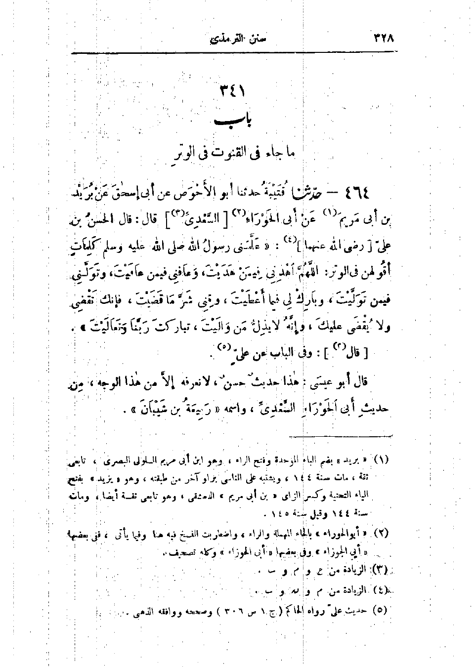 464 - حَدَّثَنَا قُتَيْبَةُ قَالَ: حَدَّثَنَا أَبُو الأَحْوَصِ، عَنْ أَبِي إِسْحَاقَ، عَنْ بُرَيْدِ بْنِ أَبِي مَرْيَمَ، عَنْ أَبِي الحَوْرَاءِ، قَالَ: قَالَ الحَسَنُ بْنُ عَلِيٍّ: عَلَّمَنِي رَسُولُ اللَّهِ صَلَّى اللَّهُ عَلَيْهِ وَسَلَّمَ كَلِمَاتٍ أَقُولُهُنَّ فِي الوِتْرِ: «§اللَّهُمَّ اهْدِنِي فِيمَنْ هَدَيْتَ، وَعَافِنِي فِيمَنْ عَافَيْتَ، وَتَوَلَّنِي فِيمَنْ تَوَلَّيْتَ، وَبَارِكْ لِي فِيمَا أَعْطَيْتَ، وَقِنِي شَرَّ مَا قَضَيْتَ، فَإِنَّكَ تَقْضِي وَلَا يُقْضَى عَلَيْكَ، وَإِنَّهُ لَا يَذِلُّ مَنْ وَالَيْتَ، تَبَارَكْتَ رَبَّنَا وَتَعَالَيْتَ» وَفِي البَابِ عَنْ عَلِيٍّ. هَذَا حَدِيثٌ حَسَنٌ لَا نَعْرِفُهُ إِلَّا مِنْ هَذَا الوَجْهِ مِنْ حَدِيثِ أَبِي الحَوْرَاءِ السَّعْدِيِّ وَاسْمُهُ رَبِيعَةُ بْنُ شَيْبَانَ، -[329]- وَلَا نَعْرِفُ عَنِ النَّبِيِّ صَلَّى اللَّهُ عَلَيْهِ وَسَلَّمَ فِي القُنُوتِ فِي الوِتْرِ شَيْئًا أَحْسَنَ مِنْ هَذَا. وَاخْتَلَفَ أَهْلُ العِلْمِ فِي القُنُوتِ فِي الوِتْرِ. فَرَأَى عَبْدُ اللَّهِ بْنُ مَسْعُودٍ القُنُوتَ فِي الوِتْرِ فِي السَّنَةِ كُلِّهَا، وَاخْتَارَ القُنُوتَ قَبْلَ الرُّكُوعِ، وَهُوَ قَوْلُ بَعْضِ أَهْلِ العِلْمِ، وَبِهِ يَقُولُ سُفْيَانُ الثَّوْرِيُّ، وَابْنُ المُبَارَكِ، وَإِسْحَاقُ، وَأَهْلُ الكُوفَةِ، وَقَدْ رُوِيَ عَنْ عَلِيِّ بْنِ أَبِي طَالِبٍ أَنَّهُ كَانَ لَا يَقْنُتُ إِلَّا فِي النِّصْفِ الآخِرِ مِنْ رَمَضَانَ، وَكَانَ يَقْنُتُ بَعْدَ الرُّكُوعِ. وَقَدْ ذَهَبَ بَعْضُ أَهْلِ العِلْمِ إِلَى هَذَا، وَبِهِ يَقُولُ الشَّافِعِيُّ، وَأَحْمَدُ