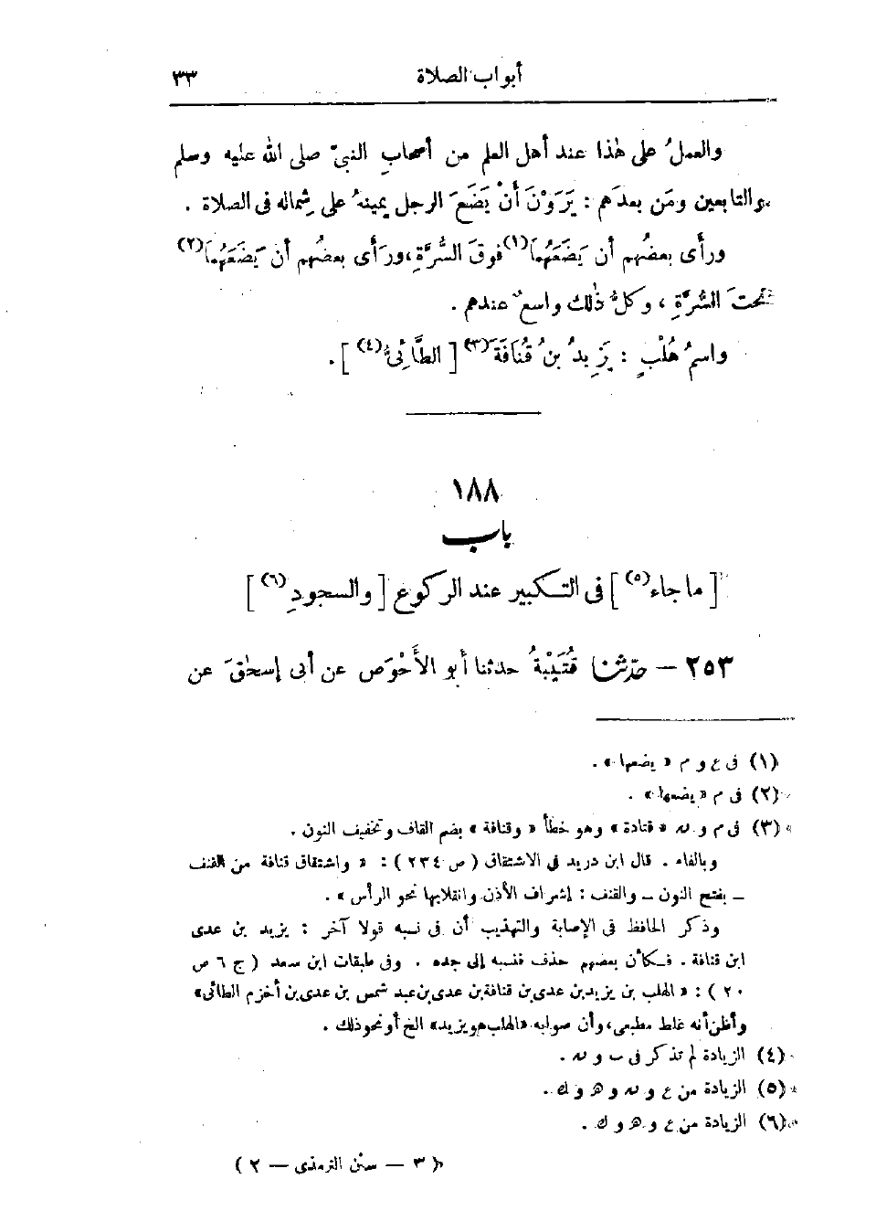 253 - حَدَّثَنَا قُتَيْبَةُ قَالَ: حَدَّثَنَا أَبُو الأَحْوَصِ، عَنْ أَبِي إِسْحَاقَ، عَنْ -[34]- عَبْدِ الرَّحْمَنِ بْنِ الأَسْوَدِ، عَنْ عَلْقَمَةَ، وَالأَسْوَدِ، عَنْ عَبْدِ اللَّهِ بْنِ مَسْعُودٍ، قَالَ: «كَانَ رَسُولُ اللَّهِ صَلَّى اللَّهُ عَلَيْهِ وَسَلَّمَ §يُكَبِّرُ فِي كُلِّ خَفْضٍ وَرَفْعٍ، وَقِيَامٍ وَقُعُودٍ، وَأَبُو بَكْرٍ، وَعُمَرُ». وَفِي البَابِ عَنْ أَبِي هُرَيْرَةَ، وَأَنَسٍ، وَابْنِ عُمَرَ، وَأَبِي مَالِكٍ الأَشْعَرِيِّ، وَأَبِي مُوسَى، وَعِمْرَانَ بْنِ حُصَيْنٍ، وَوَائِلِ بْنِ حُجْرٍ، وَابْنِ عَبَّاسٍ. حَدِيثُ عَبْدِ اللَّهِ بْنِ مَسْعُودٍ حَدِيثٌ حَسَنٌ صَحِيحٌ، وَالعَمَلُ عَلَيْهِ عِنْدَ أَصْحَابِ النَّبِيِّ صَلَّى اللَّهُ عَلَيْهِ وَسَلَّمَ مِنْهُمْ: أَبُو بَكْرٍ، وَعُمَرُ، وَعُثْمَانُ، وَعَلِيٌّ، وَغَيْرُهُمْ، وَمَنْ بَعْدَهُمْ مِنَ التَّابِعِينَ، وَعَلَيْهِ عَامَّةُ الفُقَهَاءِ وَالعُلَمَاءِ
