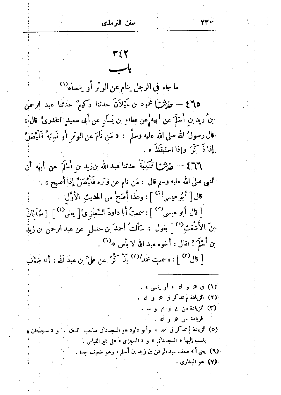 466 - حَدَّثَنَا قُتَيْبَةُ قَالَ: حَدَّثَنَا عَبْدُ اللَّهِ بْنُ زَيْدِ بْنِ أَسْلَمَ، عَنْ أَبِيهِ، أَنَّ النَّبِيَّ صَلَّى اللَّهُ عَلَيْهِ وَسَلَّمَ قَالَ: «§مَنْ نَامَ عَنْ وِتْرِهِ فَلْيُصَلِّ إِذَا أَصْبَحَ»: «وَهَذَا أَصَحُّ مِنَ الحَدِيثِ الأَوَّلِ»: سَمِعْتُ أَبَا دَاوُدَ السِّجْزِيَّ يَعْنِي سُلَيْمَانَ بْنَ الأَشْعَثِ يَقُولُ: سَأَلْتُ أَحْمَدَ بْنَ حَنْبَلٍ عَنْ عَبْدِ الرَّحْمَنِ بْنِ زَيْدِ بْنِ أَسْلَمَ، فَقَالَ: «أَخُوهُ عَبْدُ اللَّهِ لَا بَأْسَ بِهِ»، وَسَمِعْتُ مُحَمَّدًا يَذْكُرُ " عَنْ عَلِيِّ بْنِ عَبْدِ اللَّهِ أَنَّهُ ضَعَّفَ -[331]- عَبْدَ الرَّحْمَنِ بْنَ زَيْدِ بْنِ أَسْلَمَ وقَالَ: عَبْدُ اللَّهِ بْنُ زَيْدِ بْنِ أَسْلَمَ ثِقَةٌ «،» وَقَدْ ذَهَبَ بَعْضُ أَهْلِ الْكُوفَةِ إِلَى هَذَا الحَدِيثِ، وَقَالُوا: يُوتِرُ الرَّجُلُ إِذَا ذَكَرَ، وَإِنْ كَانَ بَعْدَ مَا طَلَعَتِ الشَّمْسُ، وَبِهِ يَقُولُ سُفْيَانُ الثَّوْرِيُّ "