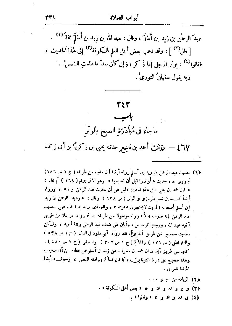 467 - حَدَّثَنَا أَحْمَدُ بْنُ مَنِيعٍ قَالَ: حَدَّثَنَا يَحْيَى بْنُ زَكَرِيَّا بْنِ أَبِي زَائِدَةَ -[332]- قَالَ: حَدَّثَنَا عُبَيْدُ اللَّهِ، عَنْ نَافِعٍ، عَنْ ابْنِ عُمَرَ، أَنَّ النَّبِيَّ صَلَّى اللَّهُ عَلَيْهِ وَسَلَّمَ قَالَ: «§بَادِرُوا الصُّبْحَ بِالوِتْرِ»: «هَذَا حَدِيثٌ حَسَنٌ صَحِيحٌ»