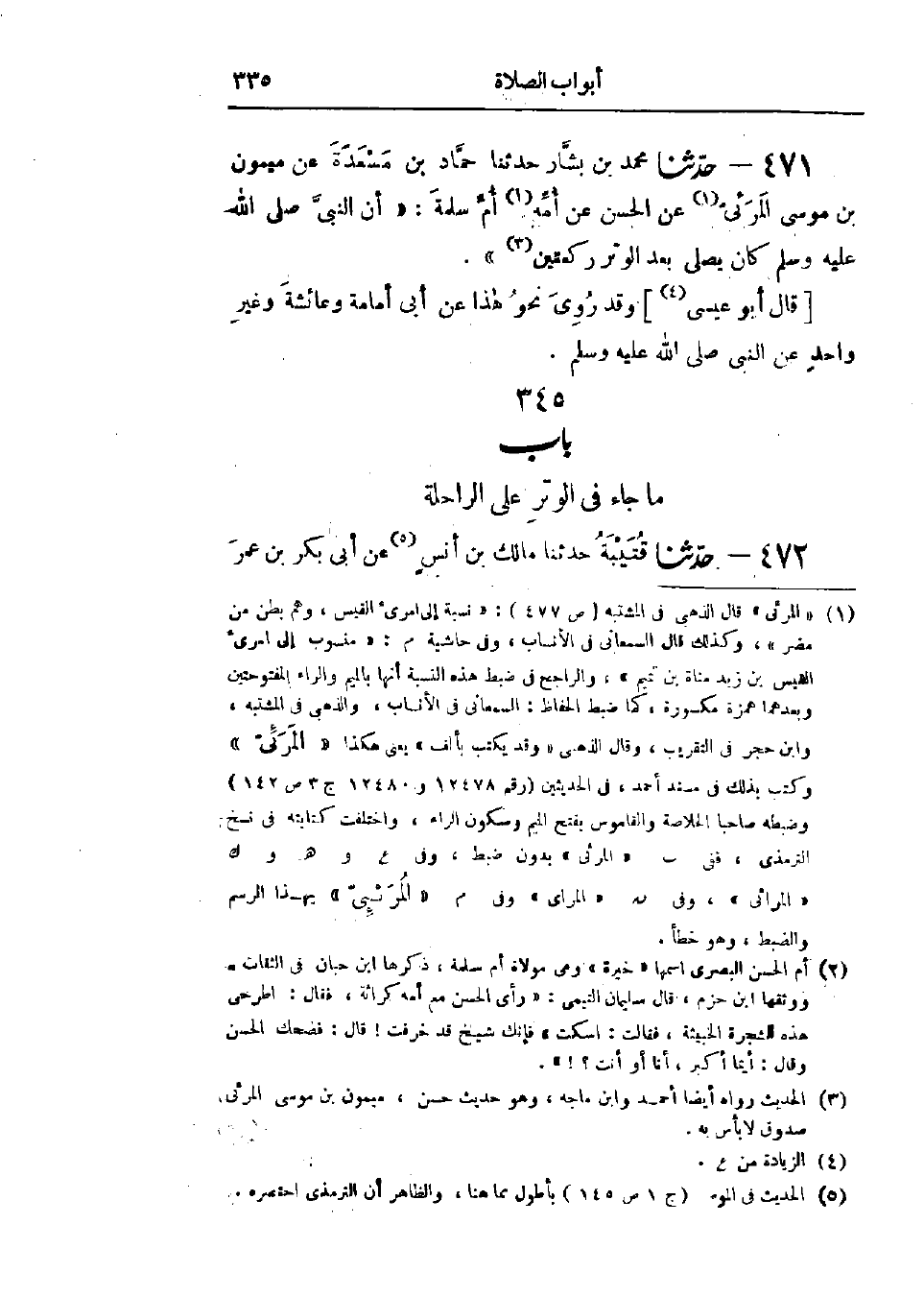 472 - حَدَّثَنَا قُتَيْبَةُ قَالَ: حَدَّثَنَا مَالِكُ بْنُ أَنَسٍ، عَنْ أَبِي بَكْرِ بْنِ عُمَرَ -[336]- بْنِ عَبْدِ الرَّحْمَنِ، عَنْ سَعِيدِ بْنِ يَسَارٍ، قَالَ: كُنْتُ أَمْشِي مَعَ ابْنِ عُمَرَ فِي سَفَرٍ، فَتَخَلَّفْتُ عَنْهُ، فَقَالَ: أَيْنَ كُنْتَ؟ فَقُلْتُ: أَوْتَرْتُ، فَقَالَ: «أَلَيْسَ لَكَ فِي رَسُولِ اللَّهِ أُسْوَةٌ حَسَنَةٌ؟ رَأَيْتُ رَسُولَ اللَّهِ صَلَّى اللَّهُ عَلَيْهِ وَسَلَّمَ §يُوتِرُ عَلَى رَاحِلَتِهِ» وَفِي البَابِ عَنْ ابْنِ عَبَّاسٍ. حَدِيثُ ابْنِ عُمَرَ حَدِيثٌ حَسَنٌ صَحِيحٌ، وَقَدْ ذَهَبَ بَعْضُ أَهْلِ العِلْمِ مِنْ أَصْحَابِ النَّبِيِّ صَلَّى اللَّهُ عَلَيْهِ وَسَلَّمَ وَغَيْرِهِمْ إِلَى هَذَا: وَرَأَوْا أَنْ يُوتِرَ الرَّجُلُ عَلَى رَاحِلَتِهِ، وَبِهِ يَقُولُ الشَّافِعِيُّ، وَأَحْمَدُ، وَإِسْحَاقُ، وقَالَ بَعْضُ أَهْلِ العِلْمِ: لَا يُوتِرُ الرَّجُلُ عَلَى الرَّاحِلَةِ، فَإِذَا أَرَادَ أَنْ يُوتِرَ نَزَلَ فَأَوْتَرَ عَلَى الأَرْضِ، وَهُوَ قَوْلُ بَعْضِ أَهْلِ الكُوفَةِ