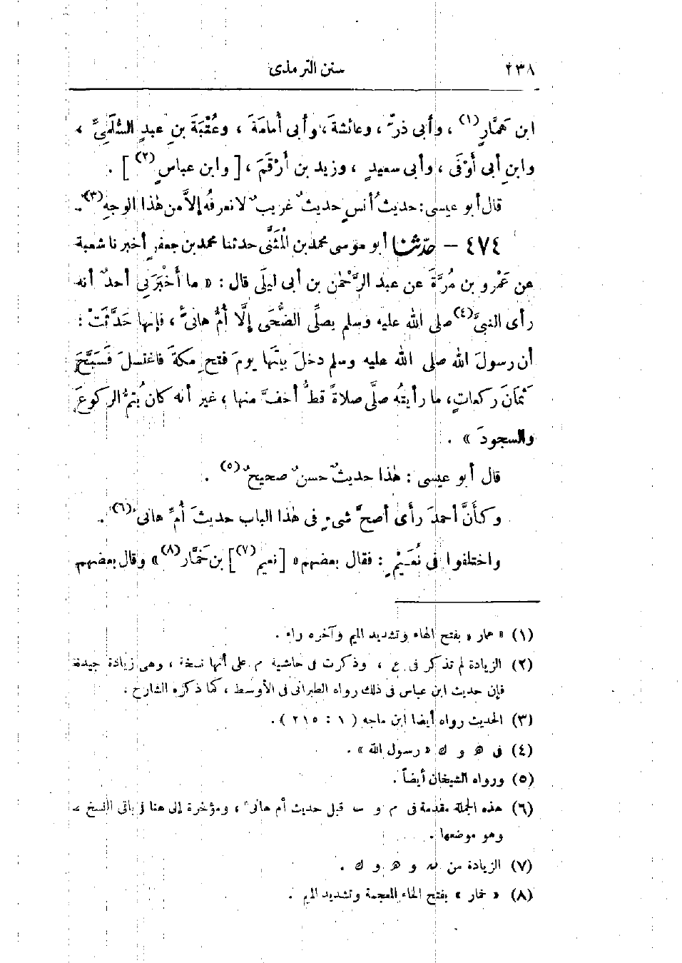 474 - حَدَّثَنَا أَبُو مُوسَى مُحَمَّدُ بْنُ المُثَنَّى قَالَ: حَدَّثَنَا مُحَمَّدُ بْنُ جَعْفَرٍ قَالَ: أَخْبَرَنَا شُعْبَةُ، عَنْ عَمْرِو بْنِ مُرَّةَ، عَنْ عَبْدِ الرَّحْمَنِ بْنِ أَبِي لَيْلَى، قَالَ: مَا أَخْبَرَنِي أَحَدٌ أَنَّهُ رَأَى النَّبِيَّ صَلَّى اللَّهُ عَلَيْهِ وَسَلَّمَ يُصَلِّي الضُّحَى، إِلَّا أُمَّ هَانِئٍ، فَإِنَّهَا حَدَّثَتْ «أَنَّ رَسُولَ اللَّهِ صَلَّى اللَّهُ عَلَيْهِ وَسَلَّمَ دَخَلَ بَيْتَهَا يَوْمَ فَتْحِ مَكَّةَ §فَاغْتَسَلَ، فَسَبَّحَ ثَمَانَ رَكَعَاتٍ، مَا رَأَيْتُهُ صَلَّى صَلَاةً قَطُّ أَخَفَّ مِنْهَا، غَيْرَ أَنَّهُ كَانَ يُتِمُّ الرُّكُوعَ وَالسُّجُودَ»: «هَذَا حَدِيثٌ حَسَنٌ صَحِيحٌ»، «وَكَأَنَّ أَحْمَدَ رَأَى أَصَحَّ شَيْءٍ فِي هَذَا البَابِ حَدِيثَ أُمِّ هَانِئٍ»، " وَاخْتَلَفُوا فِي نُعَيْمٍ، فَقَالَ بَعْضُهُمْ: نُعَيْمُ بْنُ خَمَّارٍ، وقَالَ بَعْضُهُمْ: -[339]- ابْنُ هَمَّارٍ، وَيُقَالُ: ابْنُ هَبَّارٍ، وَيُقَالُ: ابْنُ هَمَّامٍ، وَالصَّحِيحُ ابْنُ هَمَّارٍ، وَأَبُو نُعَيْمٍ وَهِمَ فِيهِ، فَقَالَ: ابْنُ حِمَازٍ وَأَخْطَأَ فِيهِ، ثُمَّ تَرَكَ، فَقَالَ نُعَيْمٌ: عَنِ النَّبِيِّ صَلَّى اللَّهُ عَلَيْهِ وَسَلَّمَ "،: «أَخْبَرَنِي بِذَلِكَ عَبْدُ بْنُ حُمَيْدٍ، عَنْ أَبِي نُعَيْمٍ»