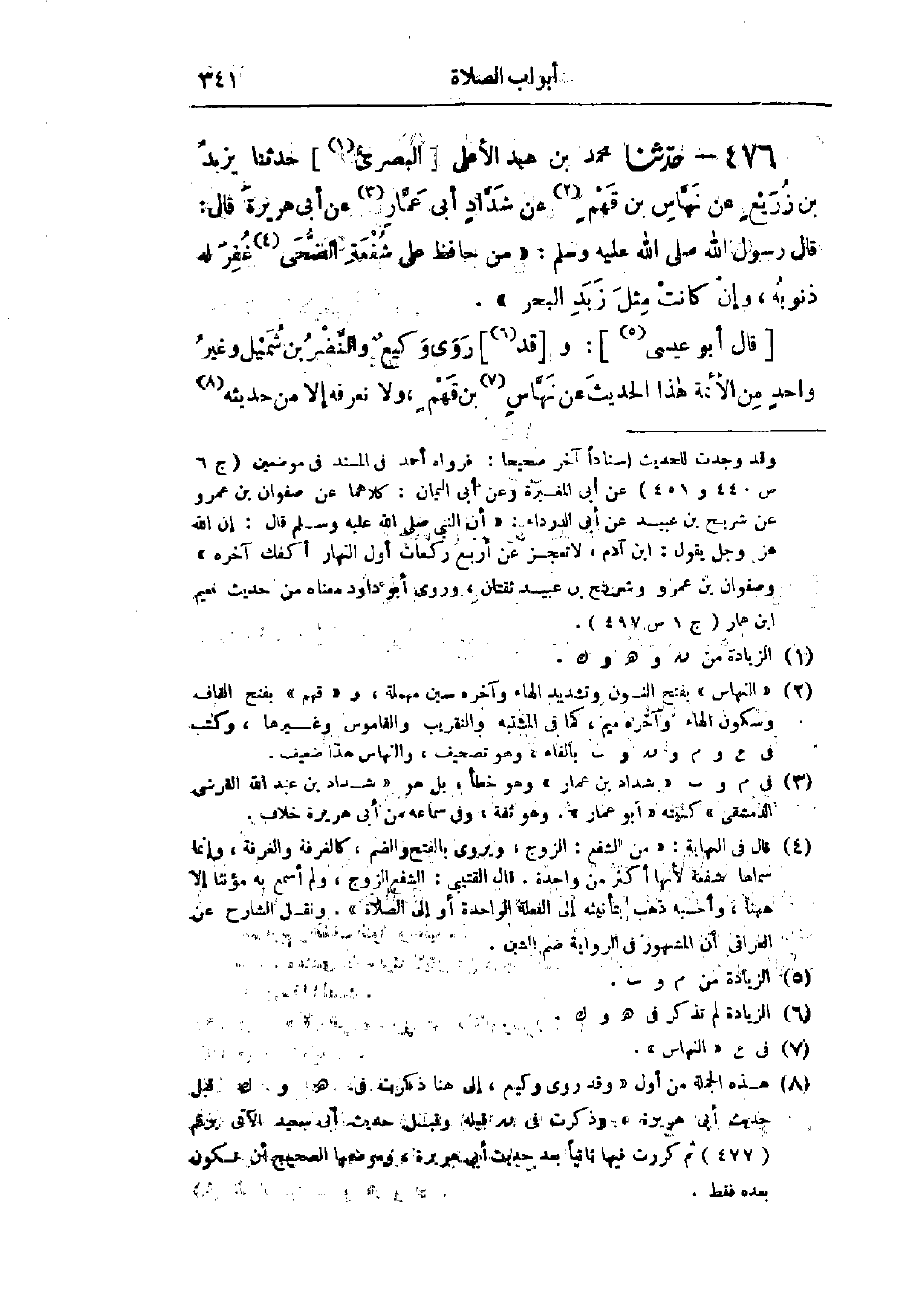 476 - حَدَّثَنَا مُحَمَّدُ بْنُ عَبْدِ الأَعْلَى البَصْرِيُّ قَالَ: حَدَّثَنَا يَزِيدُ بْنُ زُرَيْعٍ، عَنْ نَهَّاسِ بْنِ قَهْمٍ، عَنْ شَدَّادٍ أَبِي عَمَّارٍ، عَنْ أَبِي هُرَيْرَةَ، قَالَ: قَالَ رَسُولُ اللَّهِ صَلَّى اللَّهُ عَلَيْهِ وَسَلَّمَ: «§مَنْ حَافَظَ عَلَى شُفْعَةِ الضُّحَى غُفِرَ لَهُ ذُنُوبُهُ وَإِنْ كَانَتْ مِثْلَ زَبَدِ البَحْرِ»: وَقَدْ رَوَى وَكِيعٌ، وَالنَّضْرُ بْنُ شُمَيْلٍ، وَغَيْرُ وَاحِدٍ مِنَ الأَئِمَّةِ هَذَا الحَدِيثَ، عَنْ نَهَّاسِ بْنِ قَهْمٍ «وَلَا نَعْرِفُهُ إِلَّا مِنْ حَدِيثِهِ»