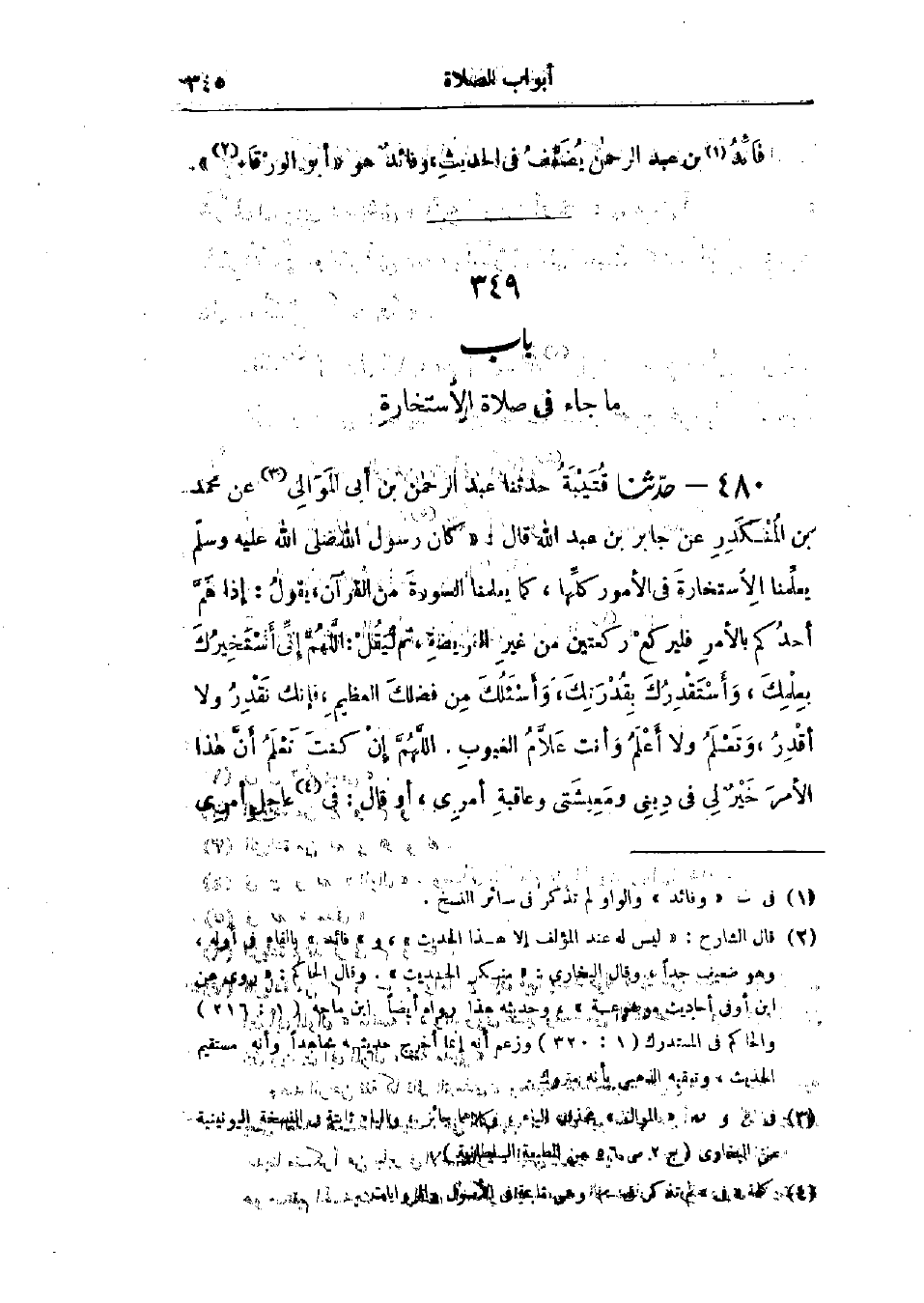 480 - حَدَّثَنَا قُتَيْبَةُ قَالَ: حَدَّثَنَا عَبْدُ الرَّحْمَنِ بْنُ أَبِي المَوَالِي، عَنْ مُحَمَّدِ بْنِ المُنْكَدِرِ، عَنْ جَابِرِ بْنِ عَبْدِ اللَّهِ، قَالَ: كَانَ رَسُولُ اللَّهِ صَلَّى اللَّهُ عَلَيْهِ وَسَلَّمَ يُعَلِّمُنَا الِاسْتِخَارَةَ فِي الأُمُورِ كُلِّهَا كَمَا يُعَلِّمُنَا السُّورَةَ مِنَ القُرْآنِ، يَقُولُ: " §إِذَا هَمَّ أَحَدُكُمْ بِالأَمْرِ فَلْيَرْكَعْ رَكْعَتَيْنِ مِنْ غَيْرِ الفَرِيضَةِ، ثُمَّ لِيَقُلْ: اللَّهُمَّ إِنِّي أَسْتَخِيرُكَ بِعِلْمِكَ، وَأَسْتَقْدِرُكَ بِقُدْرَتِكَ، وَأَسْأَلُكَ مِنْ فَضْلِكَ العَظِيمِ، فَإِنَّكَ تَقْدِرُ وَلَا أَقْدِرُ، وَتَعْلَمُ وَلَا أَعْلَمُ، وَأَنْتَ عَلَّامُ الغُيُوبِ، اللَّهُمَّ إِنْ كُنْتَ تَعْلَمُ أَنَّ هَذَا الأَمْرَ خَيْرٌ لِي فِي دِينِي وَمَعِيشَتِي وَعَاقِبَةِ أَمْرِي - أَوْ قَالَ: فِي عَاجِلِ أَمْرِي -[346]- وَآجِلِهِ - فَيَسِّرْهُ لِي، ثُمَّ بَارِكْ لِي فِيهِ، وَإِنْ كُنْتَ تَعْلَمُ أَنَّ هَذَا الأَمْرَ شَرٌّ لِي فِي دِينِي وَمَعِيشَتِي وَعَاقِبَةِ أَمْرِي - أَوْ قَالَ: فِي عَاجِلِ أَمْرِي وَآجِلِهِ - فَاصْرِفْهُ عَنِّي، وَاصْرِفْنِي عَنْهُ، وَاقْدُرْ لِي الخَيْرَ حَيْثُ كَانَ، ثُمَّ أَرْضِنِي بِهِ، قَالَ: وَيُسَمِّي حَاجَتَهُ " وَفِي البَابِ عَنْ عَبْدِ اللَّهِ بْنِ مَسْعُودٍ، وَأَبِي أَيُّوبَ: حَدِيثُ جَابِرٍ حَدِيثٌ حَسَنٌ صَحِيحٌ غَرِيبٌ لَا نَعْرِفُهُ إِلَّا مِنْ حَدِيثِ عَبْدِ الرَّحْمَنِ بْنِ أَبِي المَوَالِ وَهُوَ شَيْخٌ مَدِينِيٌّ ثِقَةٌ، رَوَى عَنْهُ سُفْيَانُ حَدِيثًا، وَقَدْ رَوَى عَنْ عَبْدِ الرَّحْمَنِ غَيْرُ وَاحِدٍ مِنَ الأَئِمَّةِ
