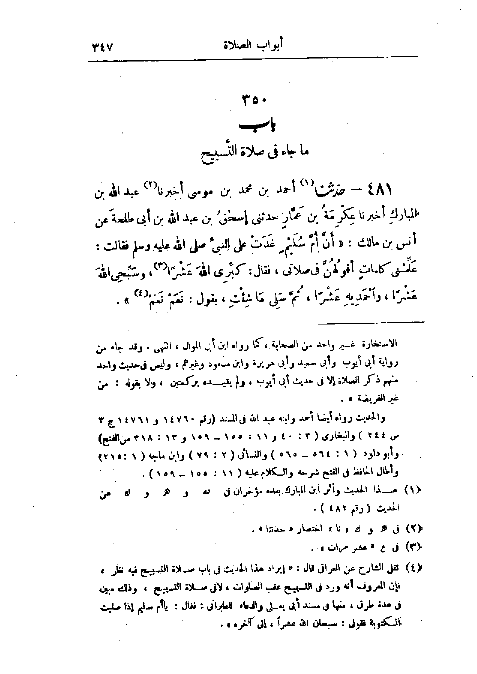 481 - حَدَّثَنَا أَحْمَدُ بْنُ مُحَمَّدِ بْنِ مُوسَى قَالَ: أَخْبَرَنَا عَبْدُ اللَّهِ بْنُ المُبَارَكِ قَالَ: أَخْبَرَنَا عِكْرِمَةُ بْنُ عَمَّارٍ قَالَ: حَدَّثَنِي إِسْحَاقُ بْنُ عَبْدِ اللَّهِ بْنِ أَبِي طَلْحَةَ، عَنْ أَنَسِ بْنِ مَالِكٍ، أَنَّ أُمَّ سُلَيْمٍ، غَدَتْ عَلَى النَّبِيِّ صَلَّى اللَّهُ عَلَيْهِ وَسَلَّمَ، فَقَالَتْ: عَلِّمْنِي كَلِمَاتٍ أَقُولُهُنَّ فِي صَلَاتِي، فَقَالَ: «§كَبِّرِي اللَّهَ عَشْرًا، وَسَبِّحِي اللَّهَ عَشْرًا، وَاحْمَدِيهِ عَشْرًا، ثُمَّ سَلِي مَا شِئْتِ»، يَقُولُ: نَعَمْ نَعَمْ -[348]- وَفِي البَابِ عَنْ ابْنِ عَبَّاسٍ، وَعَبْدِ اللَّهِ بْنِ عَمْرٍو، وَالفَضْلِ بْنِ عَبَّاسٍ، وَأَبِي رَافِعٍ: «حَدِيثُ أَنَسٍ حَدِيثٌ حَسَنٌ غَرِيبٌ»، " وَقَدْ رُوِيَ عَنِ النَّبِيِّ صَلَّى اللَّهُ عَلَيْهِ وَسَلَّمَ غَيْرُ حَدِيثٍ فِي صَلَاةِ التَّسْبِيحِ، وَلَا يَصِحُّ مِنْهُ كَبِيرُ شَيْءٍ، وَقَدْ رَأَى ابْنُ المُبَارَكِ، وَغَيْرُ وَاحِدٍ مِنْ أَهْلِ العِلْمِ: صَلَاةَ التَّسْبِيحِ وَذَكَرُوا الفَضْلَ فِيهِ "