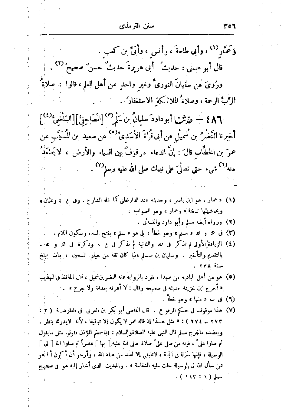 486 - حَدَّثَنَا أَبُو دَاوُدَ سُلَيْمَانُ بْنُ سَلْمٍ المَصَاحِفِيُّ البَلْخِيُّ قَالَ: أَخْبَرَنَا النَّضْرُ بْنُ شُمَيْلٍ، عَنْ أَبِي قُرَّةَ الأَسَدِيِّ، عَنْ سَعِيدِ بْنِ المُسَيِّبِ، عَنْ عُمَرَ بْنِ الخَطَّابِ، قَالَ: «إِنَّ §الدُّعَاءَ مَوْقُوفٌ بَيْنَ السَّمَاءِ وَالأَرْضِ لَا يَصْعَدُ مِنْهُ شَيْءٌ، حَتَّى تُصَلِّيَ عَلَى نَبِيِّكَ صَلَّى اللَّهُ عَلَيْهِ وَسَلَّمَ»