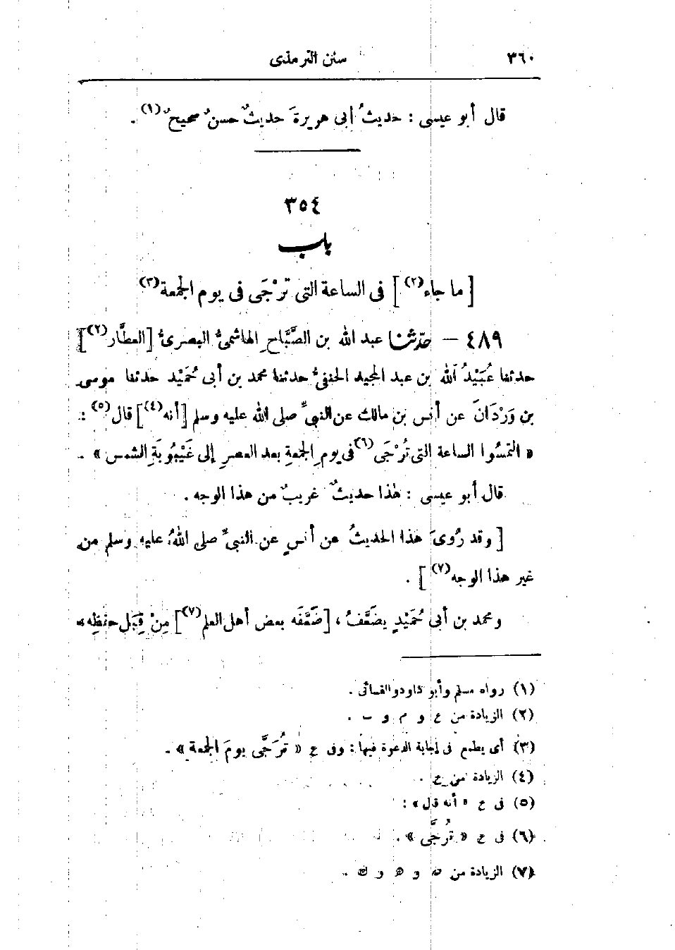 489 - حَدَّثَنَا عَبْدُ اللَّهِ بْنُ الصَّبَّاحِ الهَاشِمِيُّ البَصْرِيُّ قَالَ: حَدَّثَنَا عُبَيْدُ اللَّهِ بْنُ عَبْدِ المَجِيدِ الحَنَفِيُّ قَالَ: حَدَّثَنَا مُحَمَّدُ بْنُ أَبِي حُمَيْدٍ قَالَ: حَدَّثَنَا مُوسَى بْنُ وَرْدَانَ، عَنْ أَنَسِ بْنِ مَالِكٍ، عَنِ النَّبِيِّ صَلَّى اللَّهُ عَلَيْهِ وَسَلَّمَ قَالَ: «§التَمِسُوا السَّاعَةَ الَّتِي تُرْجَى فِي يَوْمِ الجُمُعَةِ بَعْدَ العَصْرِ إِلَى غَيْبُوبَةِ الشَّمْسِ»: «هَذَا حَدِيثٌ غَرِيبٌ مِنْ هَذَا الوَجْهِ، وَقَدْ رُوِيَ هَذَا الحَدِيثُ، عَنْ أَنَسٍ، عَنِ النَّبِيِّ صَلَّى اللَّهُ عَلَيْهِ وَسَلَّمَ مِنْ غَيْرِ هَذَا الوَجْهِ»، " وَمُحَمَّدُ بْنُ أَبِي حُمَيْدٍ يُضَعَّفُ ضَعَّفَهُ بَعْضُ أَهْلِ العِلْمِ مِنْ قِبَلِ حِفْظِهِ، -[361]- وَيُقَالُ لَهُ حَمَّادُ بْنُ أَبِي حُمَيْدٍ، وَيُقَالُ: هُوَ أَبُو إِبْرَاهِيمَ الأَنْصَارِيُّ وَهُوَ مُنْكَرُ الحَدِيثِ " وَرَأَى بَعْضُ أَهْلِ العِلْمِ مِنْ أَصْحَابِ النَّبِيِّ صَلَّى اللَّهُ عَلَيْهِ وَسَلَّمَ وَغَيْرِهِمْ: أَنَّ السَّاعَةَ الَّتِي تُرْجَى بَعْدَ العَصْرِ إِلَى أَنْ تَغْرُبَ الشَّمْسُ، وَبِهِ يَقُولُ أَحْمَدُ، وَإِسْحَاقُ " وقَالَ أَحْمَدُ: «أَكْثَرُ الأَحَادِيثِ فِي السَّاعَةِ الَّتِي تُرْجَى فِيهَا إِجَابَةُ الدَّعْوَةِ أَنَّهَا بَعْدَ صَلَاةِ العَصْرِ، وَتُرْجَى بَعْدَ زَوَالِ الشَّمْسِ»