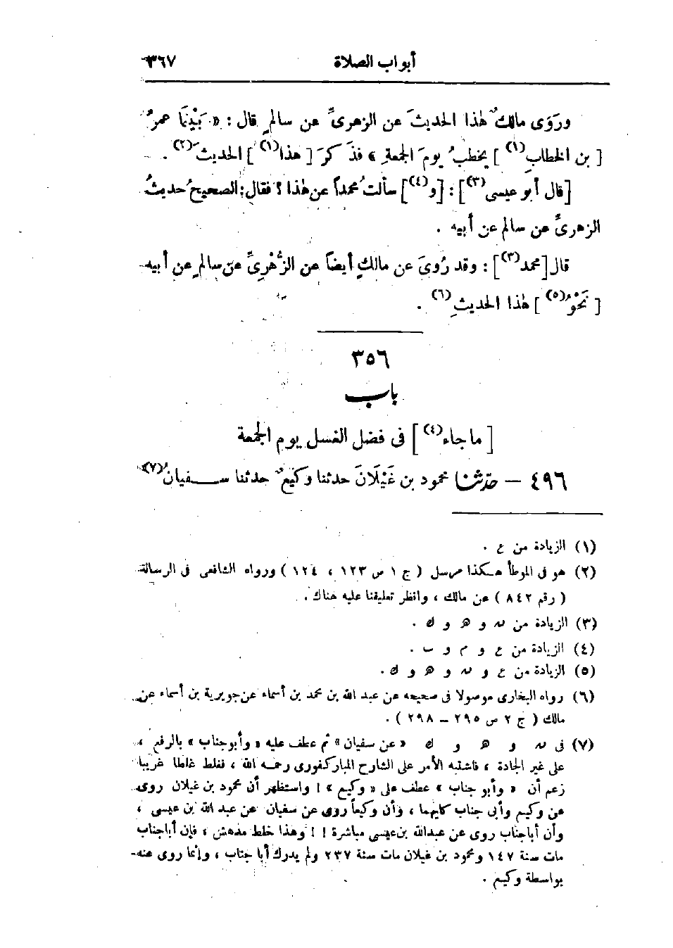 496 - حَدَّثَنَا مَحْمُودُ بْنُ غَيْلَانَ قَالَ: حَدَّثَنَا وَكِيعٌ، عَنْ سُفْيَانَ، -[368]- وَأَبِي جَنَابٍ يَحْيَى بْنِ أَبِي حَيَّةَ، عَنْ عَبْدِ اللَّهِ بْنِ عِيسَى، عَنْ يَحْيَى بْنِ الحَارِثِ، عَنْ أَبِي الأَشْعَثِ الصَّنْعَانِيِّ، عَنْ أَوْسِ بْنِ أَوْسٍ، قَالَ: قَالَ رَسُولُ اللَّهِ صَلَّى اللَّهُ عَلَيْهِ وَسَلَّمَ: «§مَنْ اغْتَسَلَ يَوْمَ الجُمُعَةِ وَغَسَّلَ، وَبَكَّرَ وَابْتَكَرَ، وَدَنَا وَاسْتَمَعَ وَأَنْصَتَ، كَانَ لَهُ بِكُلِّ خُطْوَةٍ يَخْطُوهَا أَجْرُ سَنَةٍ صِيَامُهَا وَقِيَامُهَا» قَالَ مَحْمُودٌ: قَالَ وَكِيعٌ: اغْتَسَلَ هُوَ وَغَسَّلَ امْرَأَتَهُ، وَيُرْوَى عَنِ ابْنِ المُبَارَكِ: أَنَّهُ قَالَ فِي هَذَا الحَدِيثِ: " مَنْ غَسَّلَ وَاغْتَسَلَ: يَعْنِي غَسَلَ رَأْسَهُ وَاغْتَسَلَ " وَفِي البَابِ عَنْ أَبِي بَكْرٍ، وَعِمْرَانَ بْنِ حُصَيْنٍ، وَسَلْمَانَ، وَأَبِي ذَرٍّ، وَأَبِي سَعِيدٍ، وَابْنِ عُمَرَ، وَأَبِي أَيُّوبَ: «حَدِيثُ أَوْسِ بْنِ أَوْسٍ حَدِيثٌ حَسَنٌ»، وَأَبُو الأَشْعَثِ الصَّنْعَانِيُّ اسْمُهُ شَرَاحِيلُ بْنُ آدَةَ