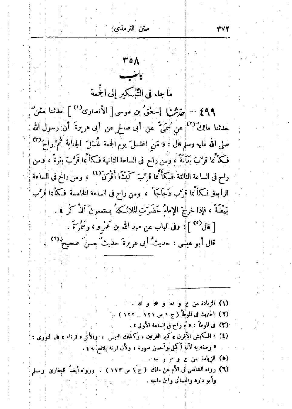 499 - حَدَّثَنَا إِسْحَاقُ بْنُ مُوسَى الأَنْصَارِيُّ قَالَ: حَدَّثَنَا مَعْنٌ قَالَ: حَدَّثَنَا مَالِكٌ، عَنْ سُمَيٍّ، عَنْ أَبِي صَالِحٍ، عَنْ أَبِي هُرَيْرَةَ، أَنَّ رَسُولَ اللَّهِ صَلَّى اللَّهُ عَلَيْهِ وَسَلَّمَ قَالَ: «§مَنْ اغْتَسَلَ يَوْمَ الجُمُعَةِ غُسْلَ الجَنَابَةِ، ثُمَّ رَاحَ فَكَأَنَّمَا قَرَّبَ بَدَنَةً، وَمَنْ رَاحَ فِي السَّاعَةِ الثَّانِيَةِ فَكَأَنَّمَا قَرَّبَ بَقَرَةً، وَمَنْ رَاحَ فِي السَّاعَةِ الثَّالِثَةِ فَكَأَنَّمَا قَرَّبَ كَبْشًا أَقْرَنَ، وَمَنْ رَاحَ فِي السَّاعَةِ الرَّابِعَةِ فَكَأَنَّمَا قَرَّبَ دَجَاجَةً، وَمَنْ رَاحَ فِي السَّاعَةِ الخَامِسَةِ فَكَأَنَّمَا قَرَّبَ بَيْضَةً، فَإِذَا خَرَجَ الإِمَامُ حَضَرَتِ المَلَائِكَةُ يَسْتَمِعُونَ الذِّكْرَ» وَفِي البَابِ عَنْ عَبْدِ اللَّهِ بْنِ عَمْرٍو، وَسَمُرَةَ: «حَدِيثُ أَبِي هُرَيْرَةَ حَدِيثٌ حَسَنٌ صَحِيحٌ»